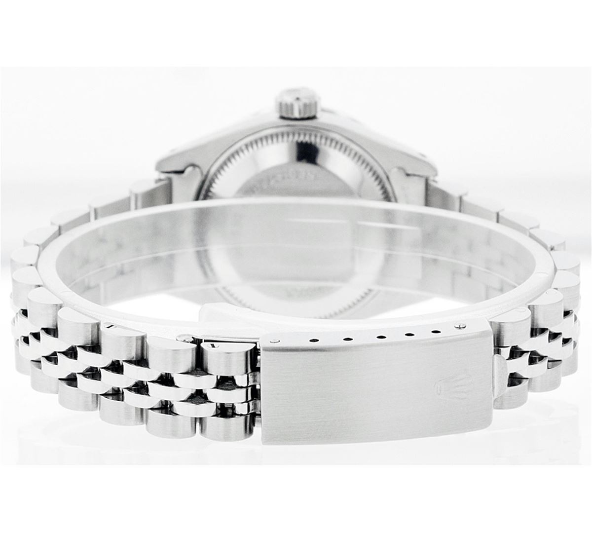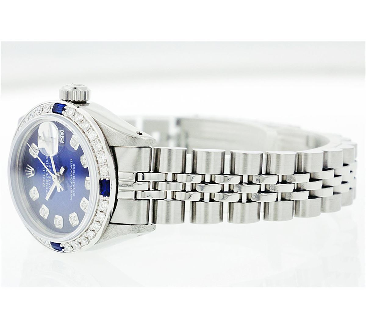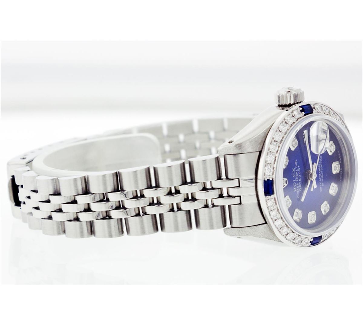 Ladies Rolex Datejust Polished Bright with Satin Finish, Serviced & Electronically Tested, Stainless Steel Case:26mm, Stainless Steel Crown, Custom Bezel: 18K White Gold Sapphire Beadset Diamond Bezel, Diamond + Gem Count: 28 Diamonds + 4 Sapphires Total Weight .70 Carat, Clarity: SI-VS, Color: G to H. Custom Crystal: Synthetic Sapphire Cyclops Lens. Movement: Automatic Winding Movement Caliber 2030. Custom Dial: Refinished Blue Vignette With Diamond Hour Markers. Date Window: 3 O'Clock Position Date Display, Quickset, Model: 6917 Condition: G-6 Extra Fine. Bracelet: Stainless Steel Jubilee. Bright Polish & Satin Finish. 5.5 Inch Length, Adjustable. Standard Clasp, With Rolex Logo.