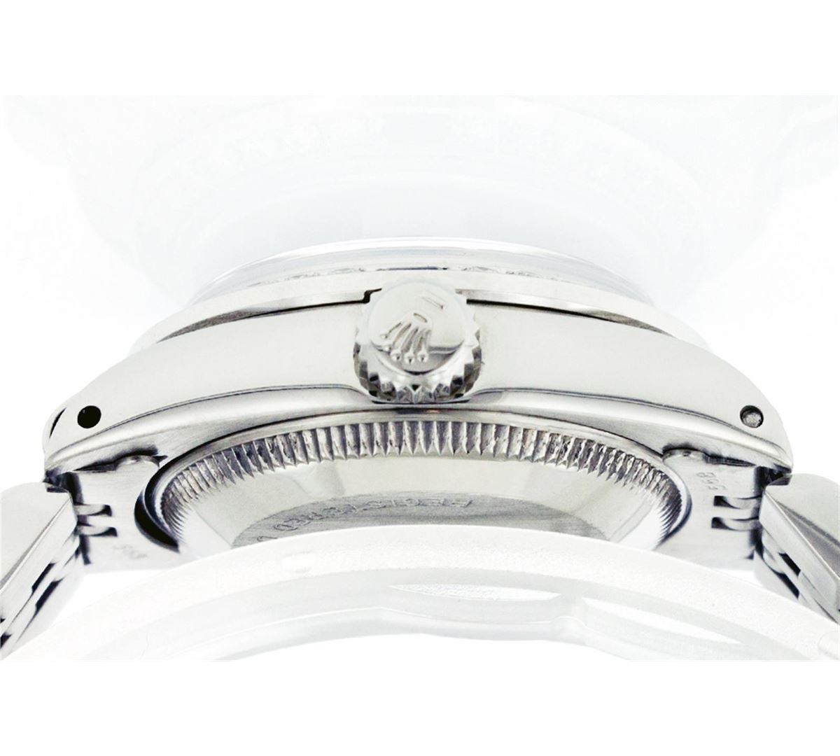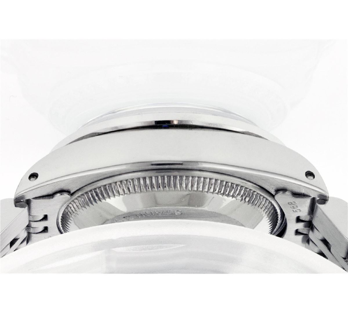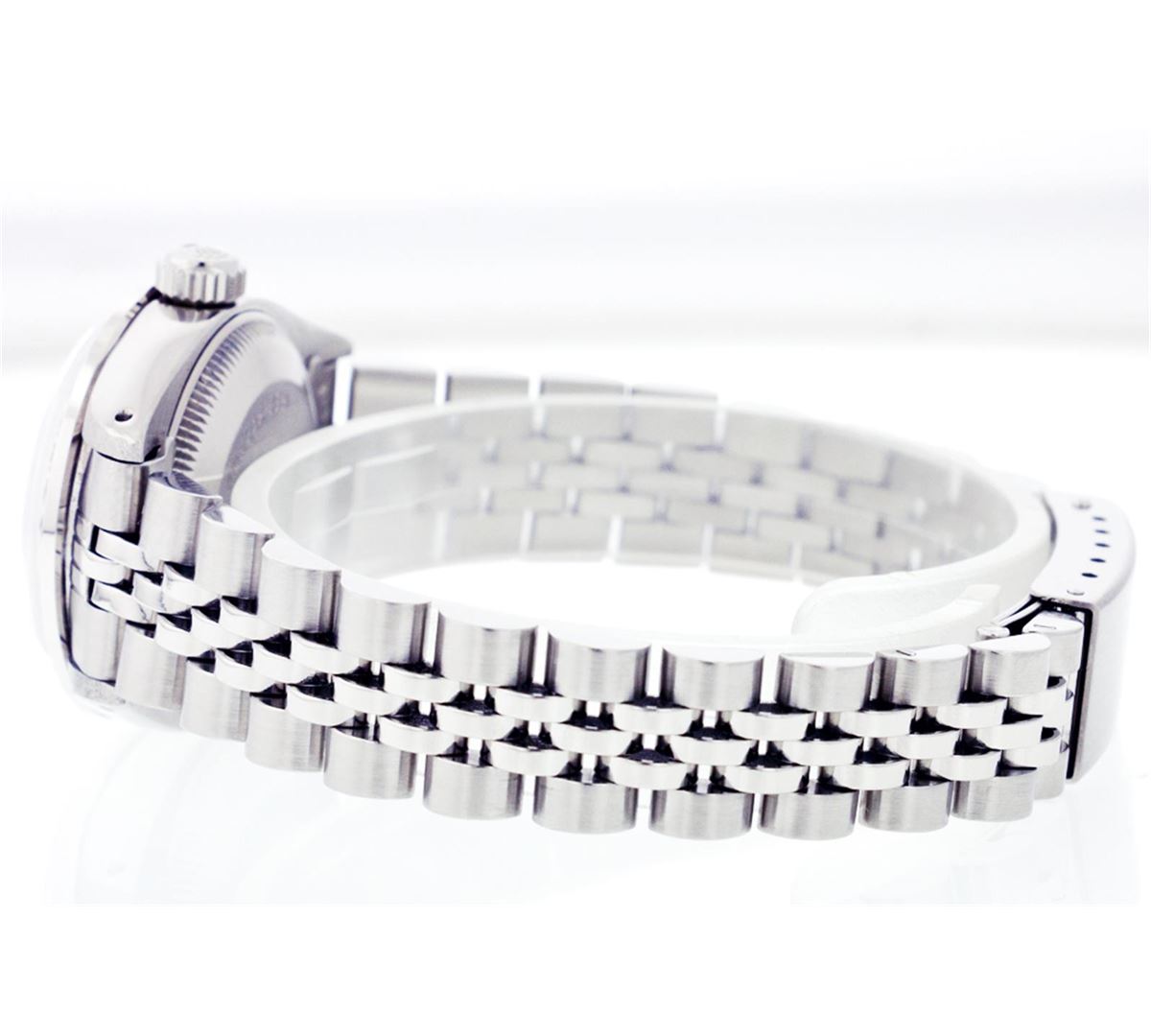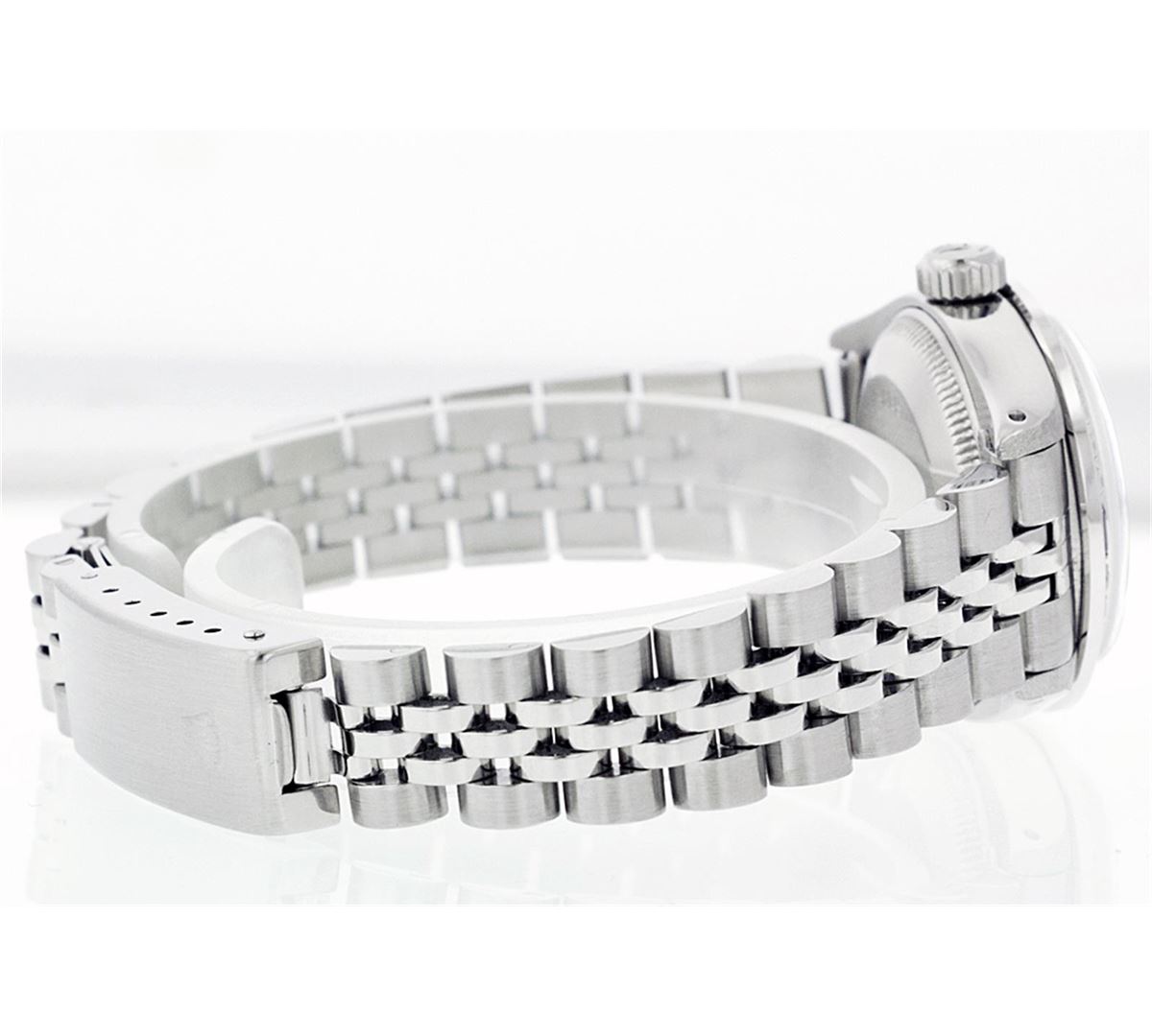 Ladies Rolex Datejust Polished Bright with Satin Finish, Serviced & Electronically Tested, Stainless Steel Case:26mm, Stainless Steel Crown, Custom Bezel: 18K White Gold Sapphire Beadset Diamond Bezel, Diamond + Gem Count: 28 Diamonds + 4 Sapphires Total Weight .70 Carat, Clarity: SI-VS, Color: G to H. Custom Crystal: Synthetic Sapphire Cyclops Lens. Movement: Automatic Winding Movement Caliber 2030. Custom Dial: Refinished Blue Vignette With Diamond Hour Markers. Date Window: 3 O'Clock Position Date Display, Quickset, Model: 6917 Condition: G-6 Extra Fine. Bracelet: Stainless Steel Jubilee. Bright Polish & Satin Finish. 5.5 Inch Length, Adjustable. Standard Clasp, With Rolex Logo.