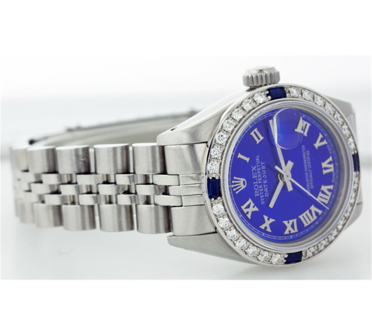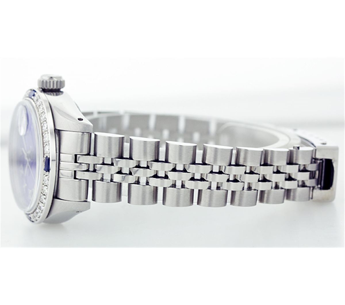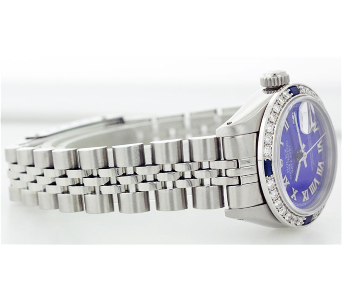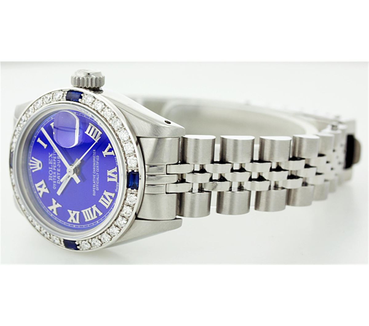 One Ladies Rolex Datejust Polished Bright with Satin Finish, Serviced & Electronically Tested, Stainless Steel Case:26mm, Stainless Steel Crown, Custom Bezel: 18K White Gold Sapphire Beadset Diamond Bezel, Diamond + Gem Count: 28 Diamonds + 4 Sapphires Total Weight .70 Carat, Clarity: SI-VS, Color: G to H. Custom Crystal: Synthetic Sapphire Cyclops Lens. Movement: Automatic Winding Movement Caliber 2030. Custom Dial: Refinished Royal Blue With Roman Hour Markers. Date Window: 3 O'Clock Position Date Display, Quickset, Model: 6917 Condition: G-6 Extra Fine. Bracelet: Stainless Steel Jubilee. Bright Polish & Satin Finish. 5.5 Inch Length, Adjustable. Standard Clasp, With Rolex Logo.