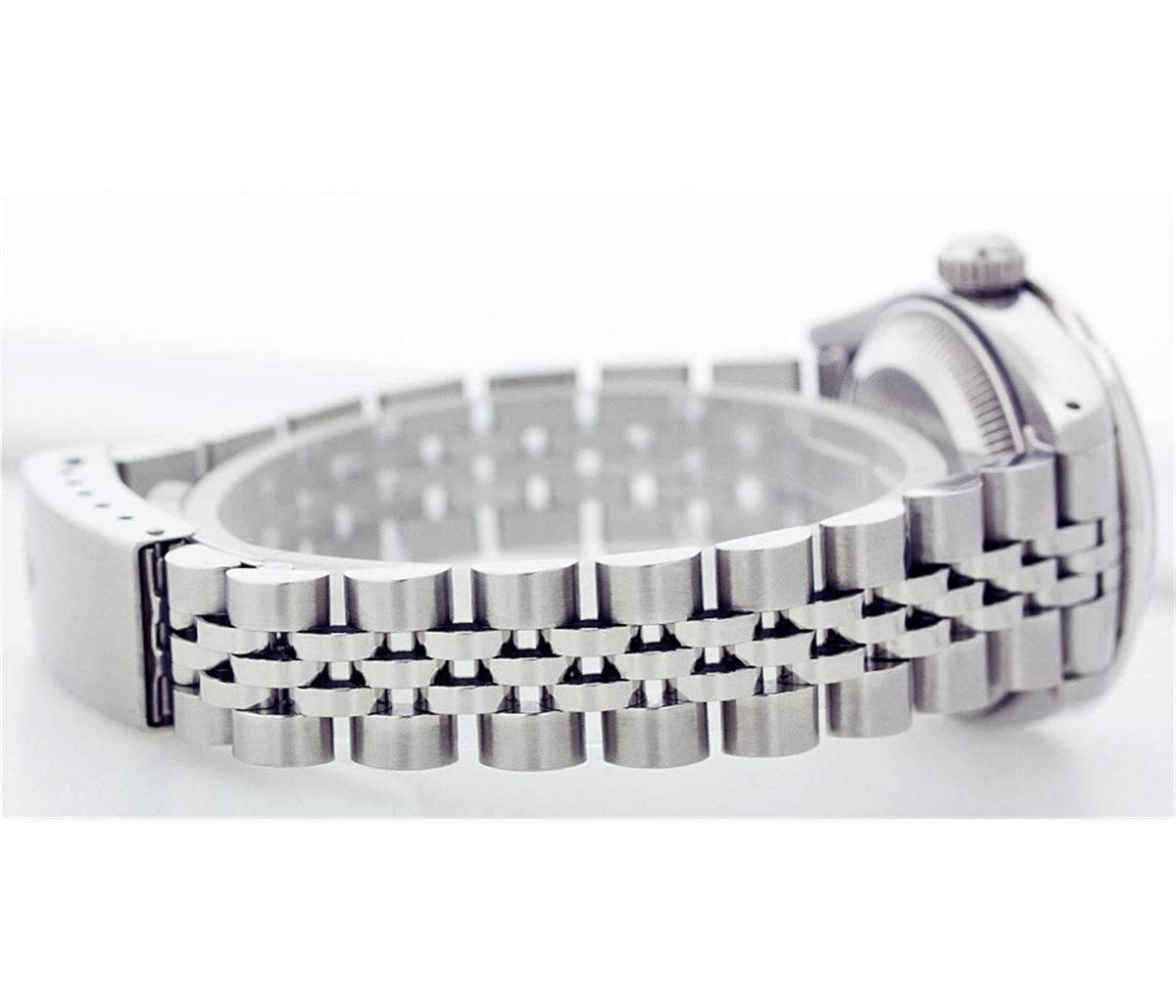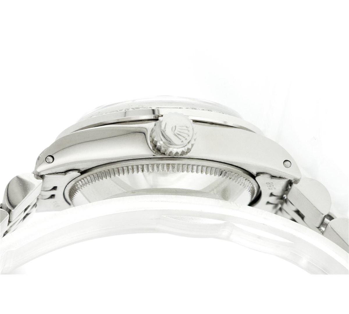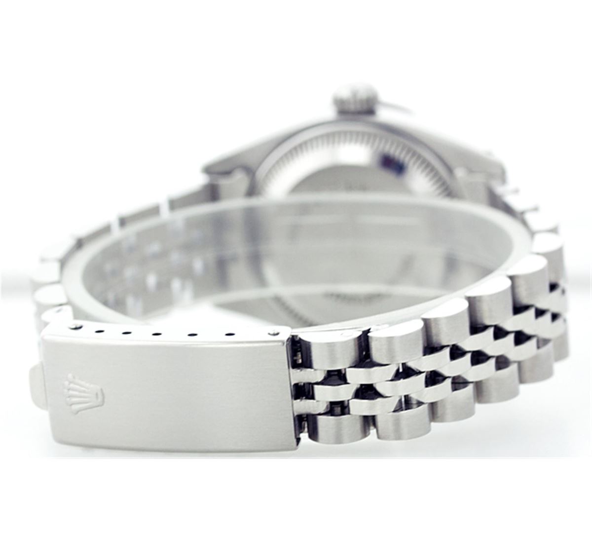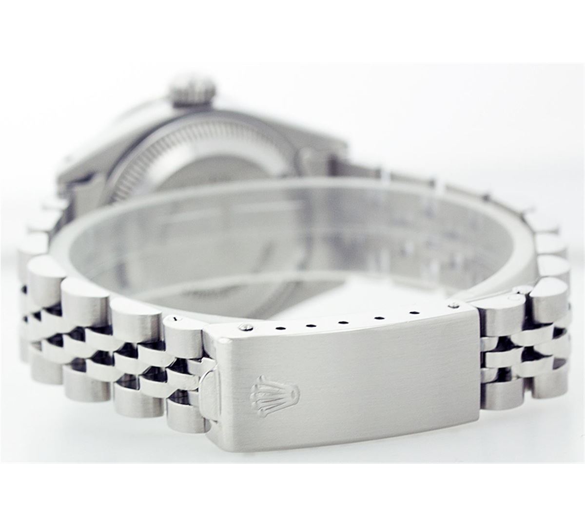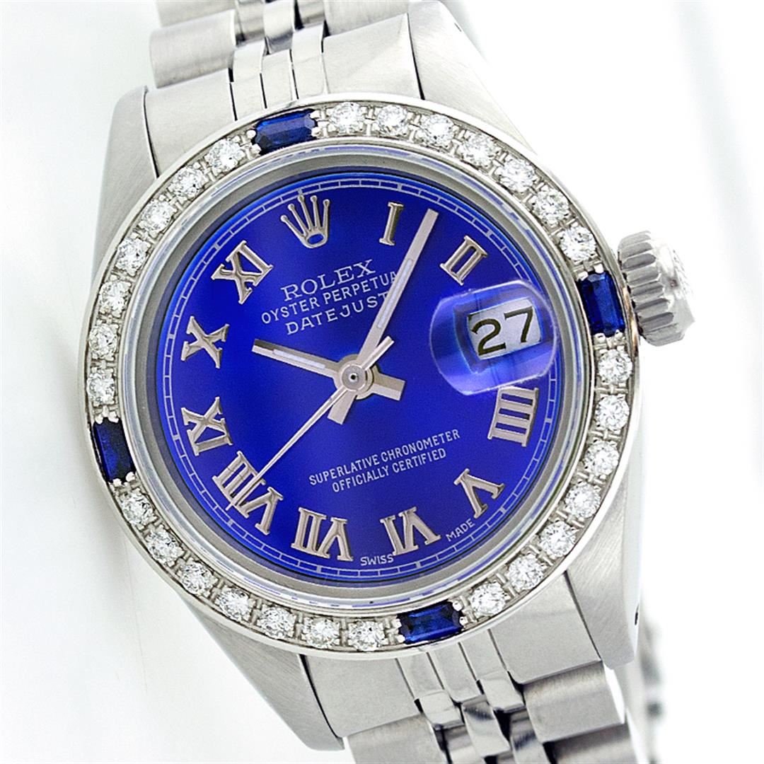 One Ladies Rolex Datejust Polished Bright with Satin Finish, Serviced & Electronically Tested, Stainless Steel Case:26mm, Stainless Steel Crown, Custom Bezel: 18K White Gold Sapphire Beadset Diamond Bezel, Diamond + Gem Count: 28 Diamonds + 4 Sapphires Total Weight .70 Carat, Clarity: SI-VS, Color: G to H. Custom Crystal: Synthetic Sapphire Cyclops Lens. Movement: Automatic Winding Movement Caliber 2030. Custom Dial: Refinished Royal Blue With Roman Hour Markers. Date Window: 3 O'Clock Position Date Display, Quickset, Model: 6917 Condition: G-6 Extra Fine. Bracelet: Stainless Steel Jubilee. Bright Polish & Satin Finish. 5.5 Inch Length, Adjustable. Standard Clasp, With Rolex Logo.