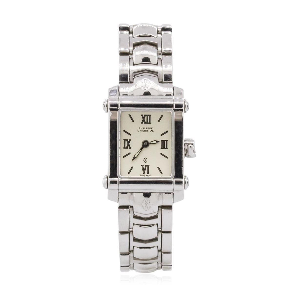 One ladies Phillipe Charriol Columbus Luxury Dress Style Wristwatch featuring: Stainless Steel Bracelet, Lugs, Crystal, Bezel, and 18mm wide Case, White Dial with Analog Display, XII, III, VI, and IX numerals, line hour markers, luminescent hour and minute hands, Swiss Quartz Battery Movement, Deployment Clasp.