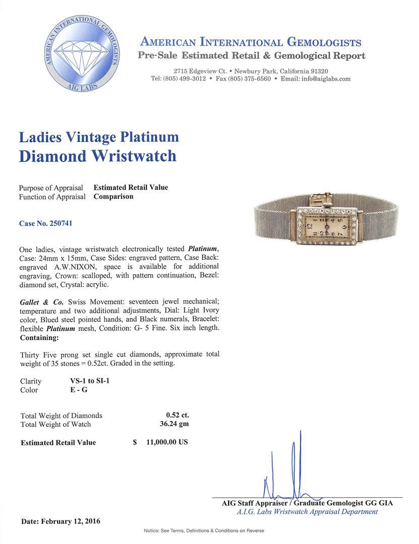 One ladies, vintage wristwatch electronically tested Platinum, Case: 24mm x 15mm, Case Sides: engraved pattern, Case Back: engraved A.W.NIXON, space is available for additional engraving, Crown: scalloped, with pattern continuation, Bezel: diamond set, Crystal: acrylic.Gallet & Co. Swiss Movement: seventeen jewel mechanical; temperature and two additional adjustments, Dial: Light Ivory color, Blued steel pointed hands, and Black numerals, Bracelet: flexible Platinum mesh, Condition: G- 5 Fine. Six inch length. Containing: Thirty Five prong set single cut diamonds, approximate total weight of 35 stones = 0.52ct. Graded in the setting. Clarity: VS-1 to SI-1. Color: E - G. Total Weight of Diamonds 0.52ct. Total Weight of Watch 36.24gm. AIG Appraised at $11,000.00.