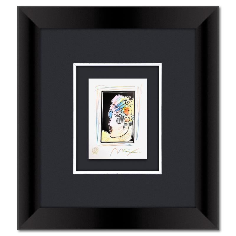 "Lady with Profile and Flowers III" is a one-of-a-kind mixed media on paper, hand signed by Peter Max. The piece comes custom framed with a backside cutout to display Peter Max Studio registration number 370116 certifying authenticity. Measures approx. 22.5" x 21.5" (frame), 8" x 6" (image).