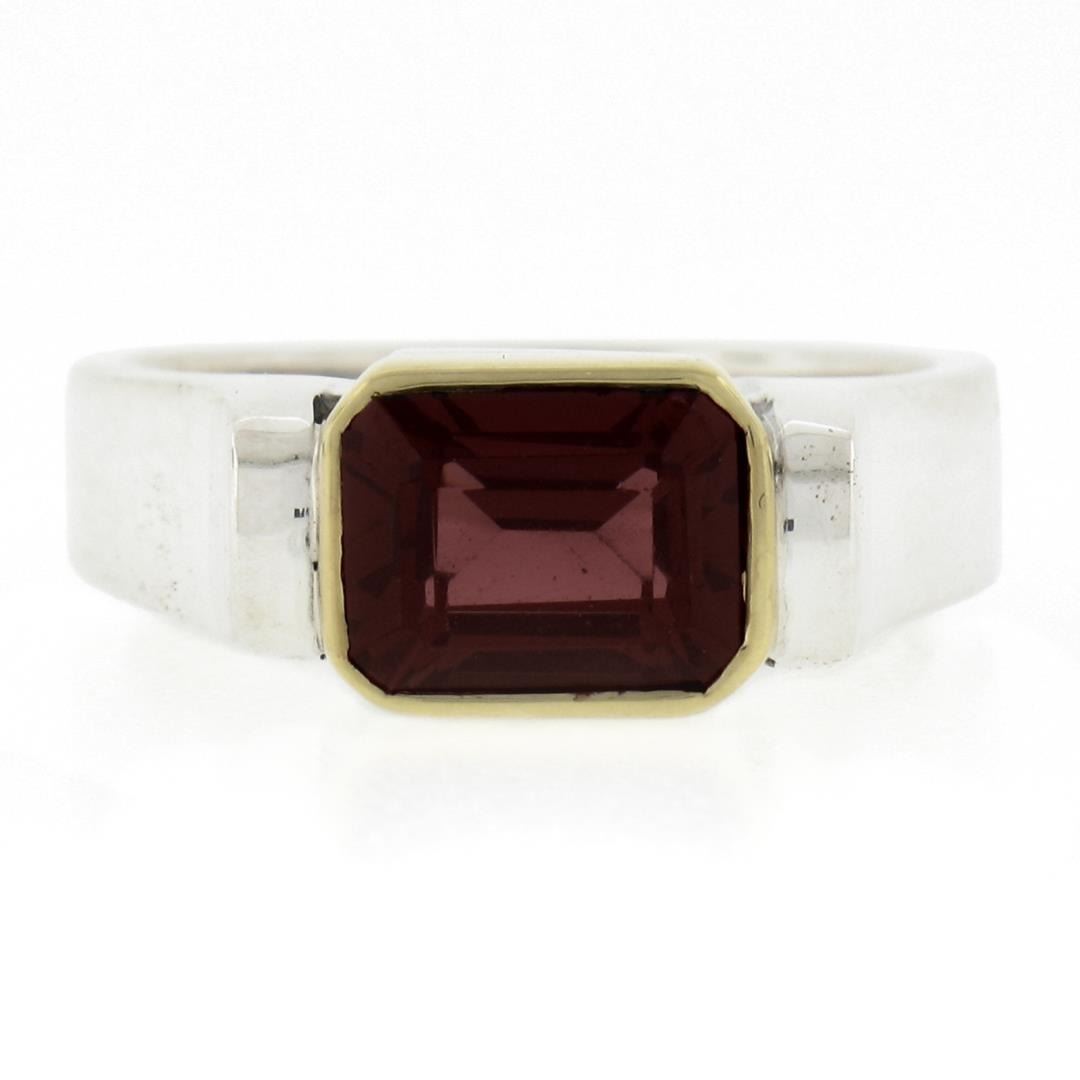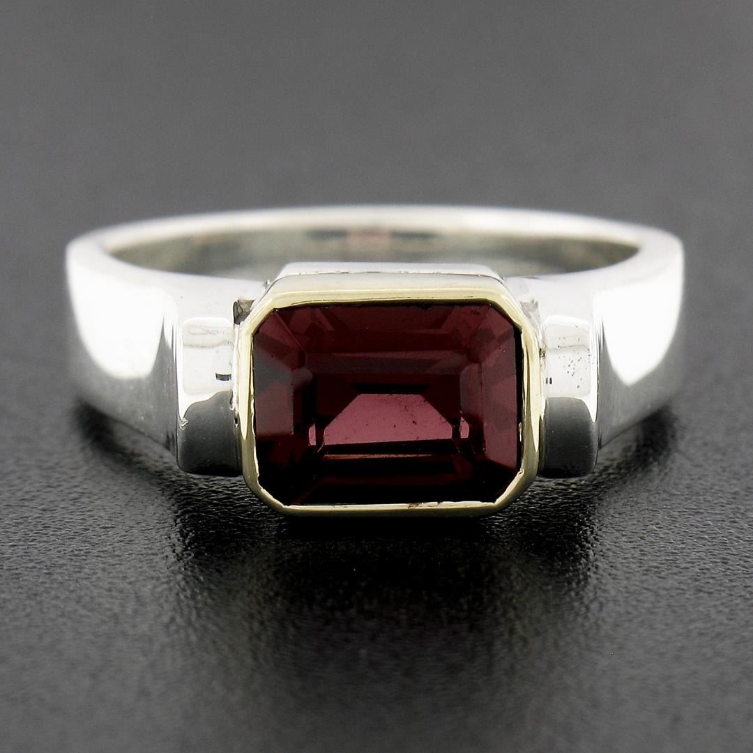 A solid 18k yellow gold & silver solitaire ring by Lagos Caviar, featuring 1 emerald cut natural rhodolite garnet (7.6x5.5mm). The ring is size 6.5, weighs a total of 5.70 grams, and measures 7.2mm wide.