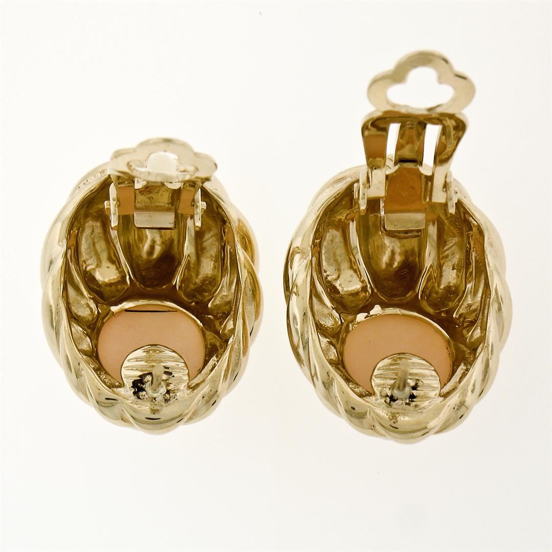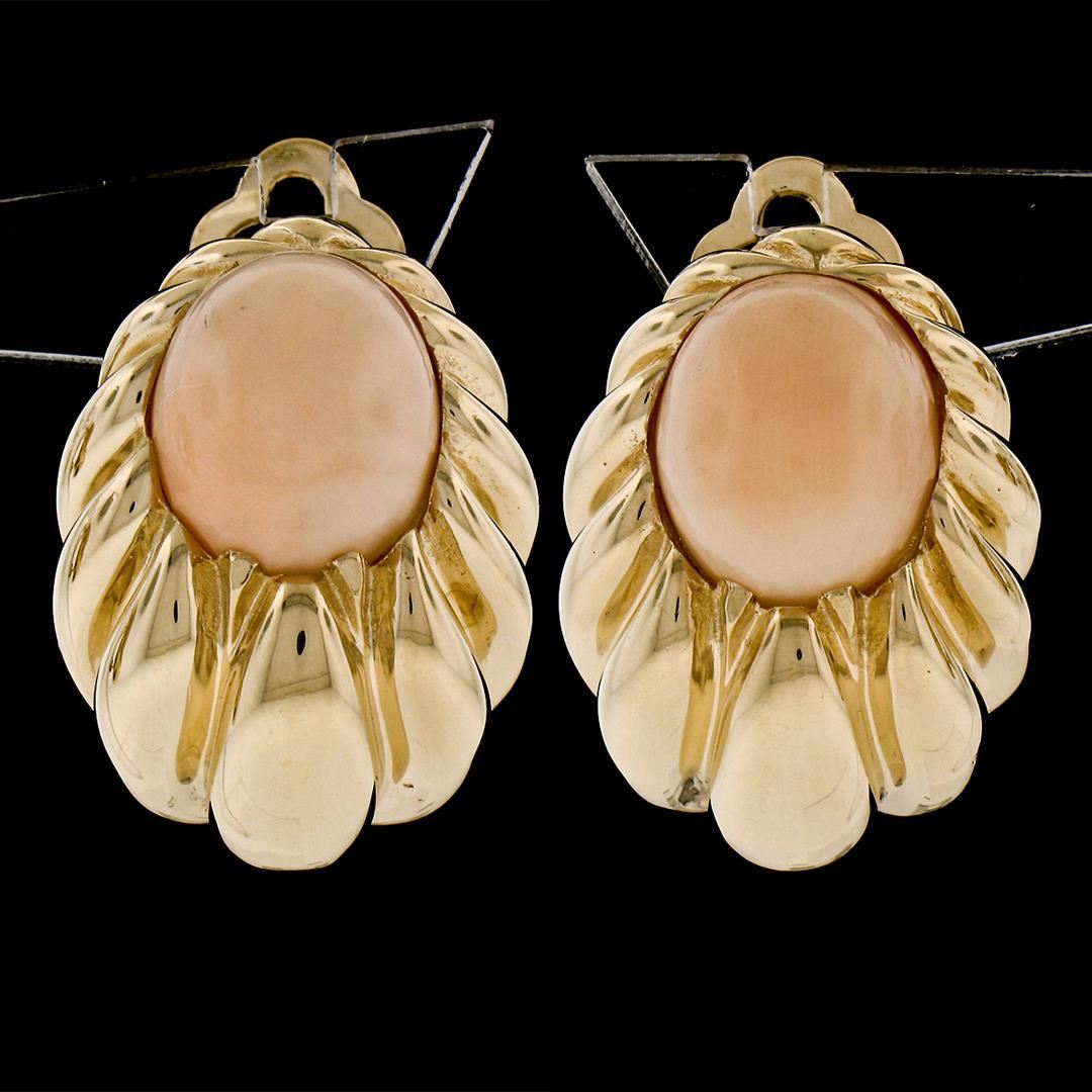 Large 14K Yellow Gold Oval Angel Skin Coral Fluted Grooved Ribbed Omega Earrings. Please see photos and description for all available information. An estate solid 14k yellow gold large earrings, with 2 oval cabochon cut natural corals (12.0x10.20mm). The earrings measure approximately 23.65x17.60mm and weigh a total of 19.37 grams.