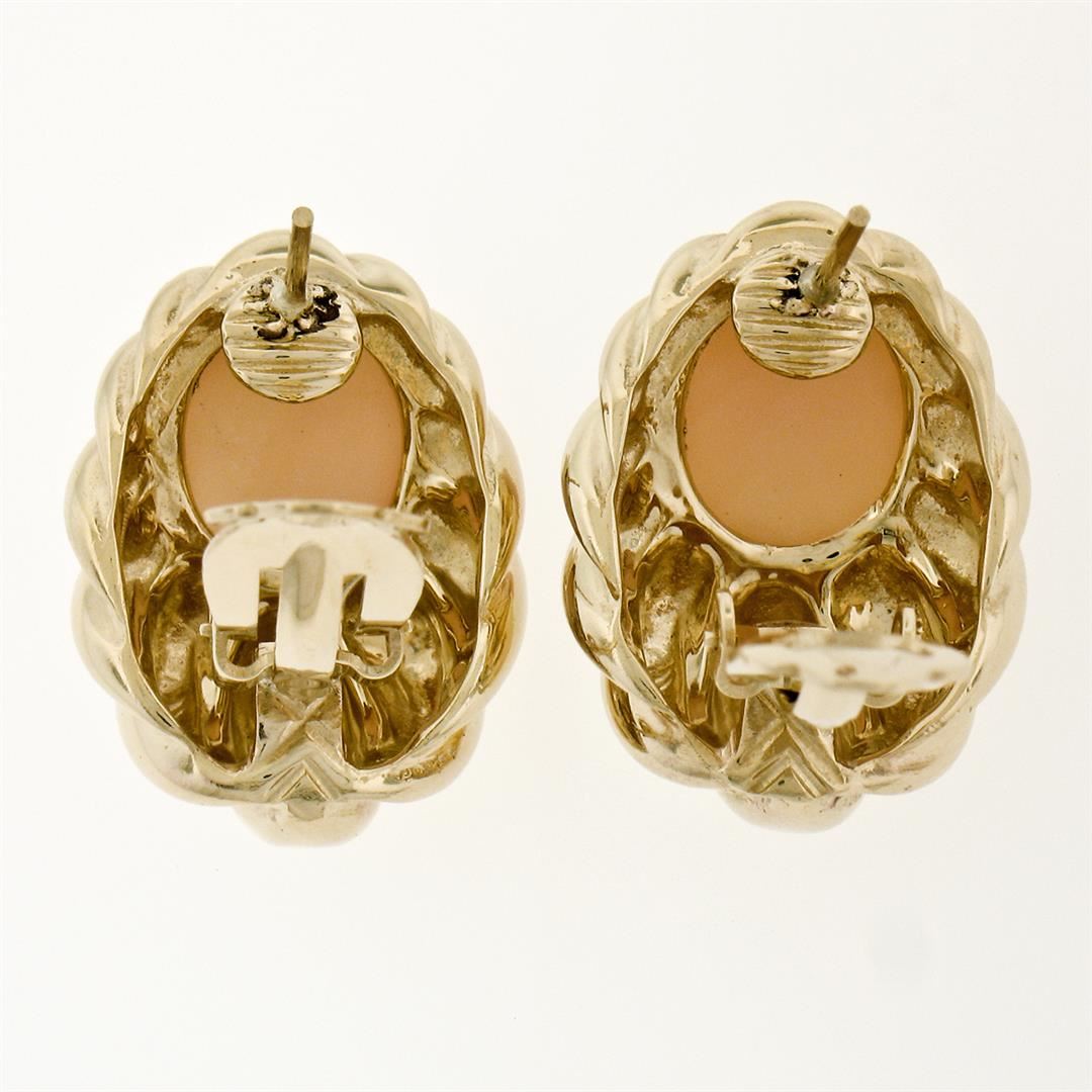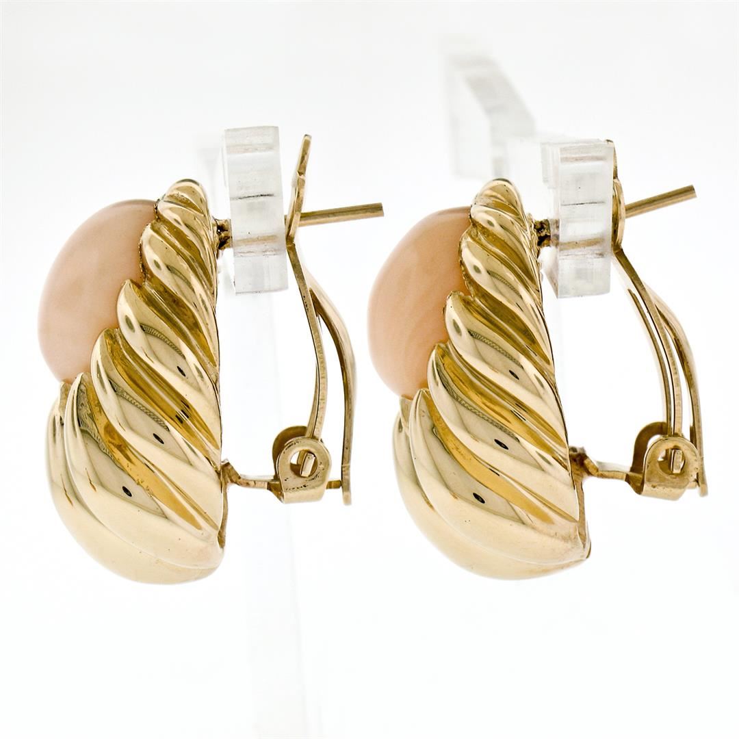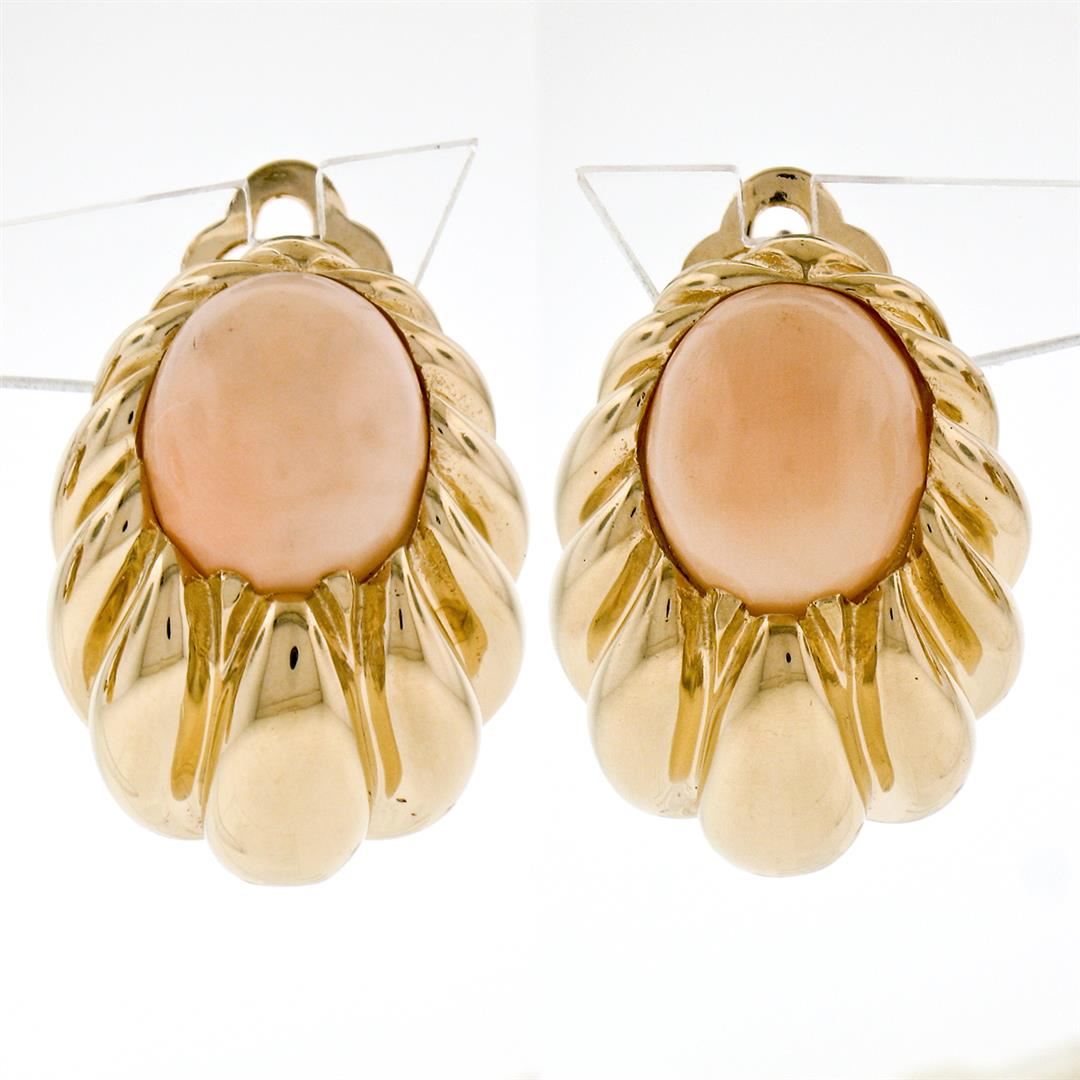 Large 14K Yellow Gold Oval Angel Skin Coral Fluted Grooved Ribbed Omega Earrings. Please see photos and description for all available information. An estate solid 14k yellow gold large earrings, with 2 oval cabochon cut natural corals (12.0x10.20mm). The earrings measure approximately 23.65x17.60mm and weigh a total of 19.37 grams.