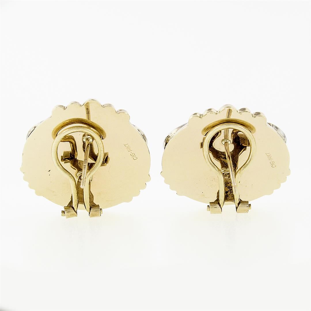 An estate solid 14k yellow & white gold button earrings, with 2 round shape mabe pearls (13.9mm), and 24 round brilliant cut natural diamonds (H/I - SI1/SI2 ; 0.12ctw). The earrings measure approximately 25.48mm in diameter and weigh a total of 9.70 grams.