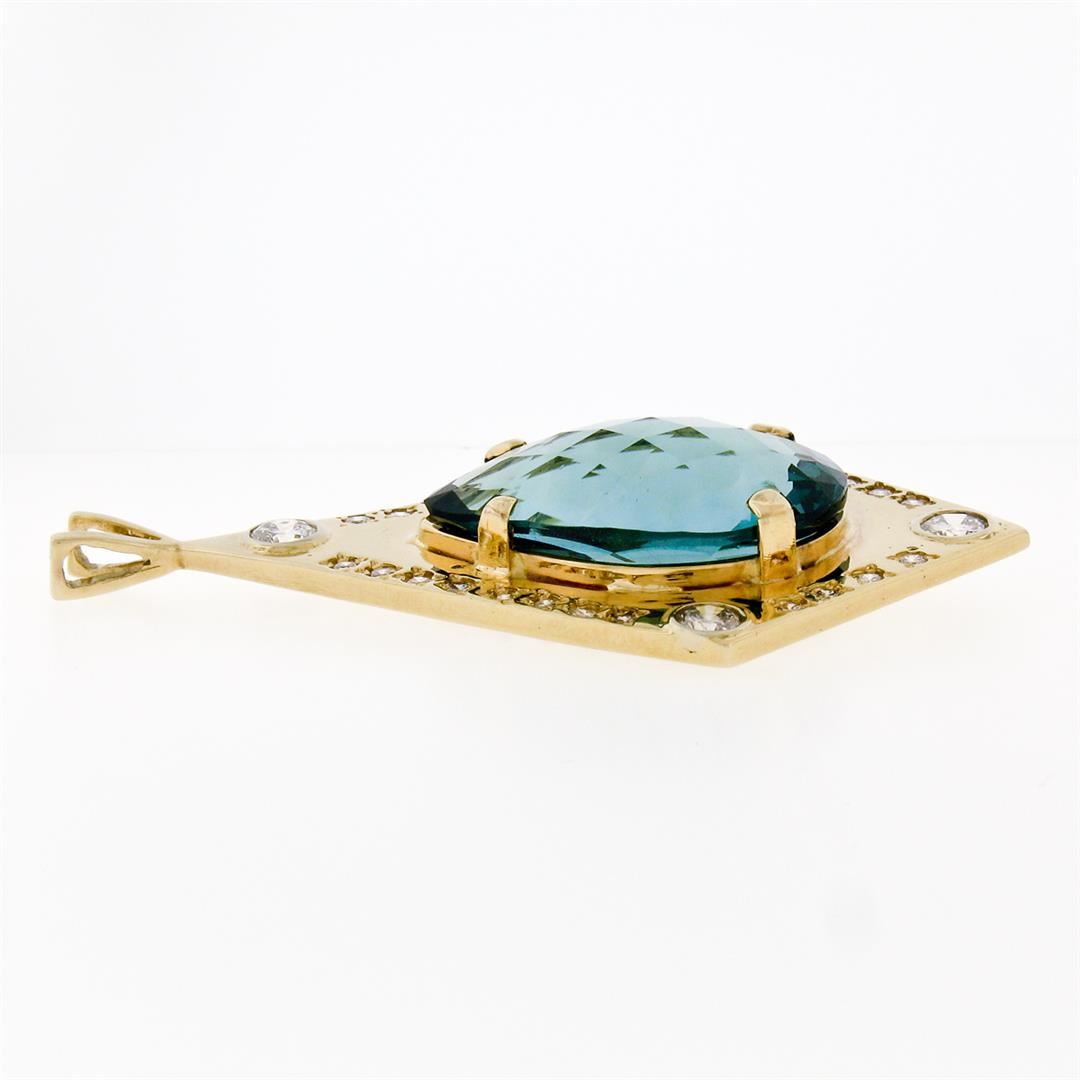 An estate solid 14k yellow gold pendant necklace, with 1 teardrop checkerboard cut natural topaz (27.14x17.66mm - 28.94ct), with 4 round brilliant cut natural diamonds (G/H - VS1/SI1: 1.40ctw), and 24 round brilliant cut natural diamonds (F/G - VS1/VS2 ; 0.60ctw). The pendant weighs a total of 23.73 grams, measures 62.71x34.91mm including the bail, and the inside of the bail measures 4.1x1.7mm.