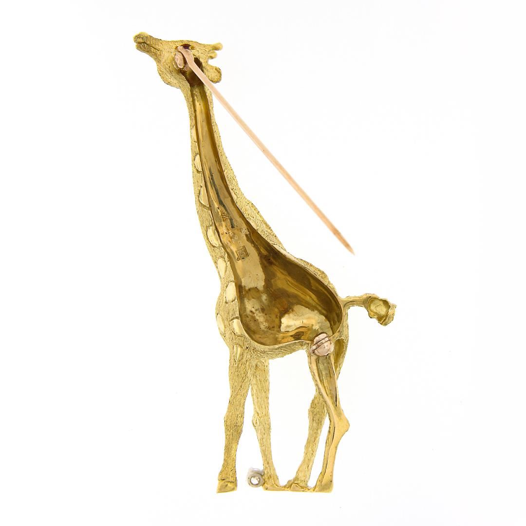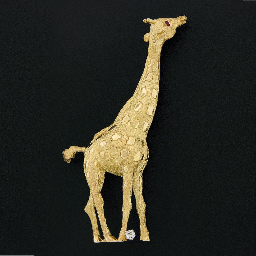 A solid 18k yellow gold giraffe brooch. with 2 round brilliant cut natural rubies (0.04ctw), and 1 rounf brilliant cut natural genuine diamond (G - VS2 ; 0.06ct ). Measures 67.10x26.50mm and weighs a total of 20.95 grams.