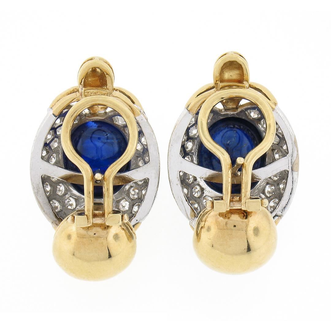 A solid 18k yellow & white Gold earrings, with 2 GIA graded oval cabochon cut natural sapphires (16+ctw), and 52 round brilliant cut natural diamonds (F/G - VS1/VS2 ; 2.0ctw). The earrings measure approximately 28x17mm and weigh a total of 21.09 grams. Comes with all original relevant certifications.