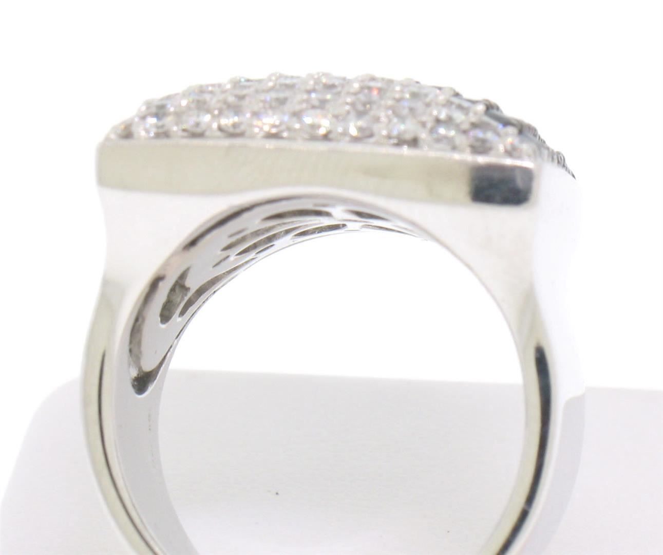 An estate solid 18k white gold square ring, featuring 65 round brillinat cut natural diamonds (F/G - VS2; 1.95ctw), and 55 round brilliant cut natural black diamonds (1.65ctw). The ring is size 7.0, weighs a total of 17.10 grams, and measures 19.50mm wide.