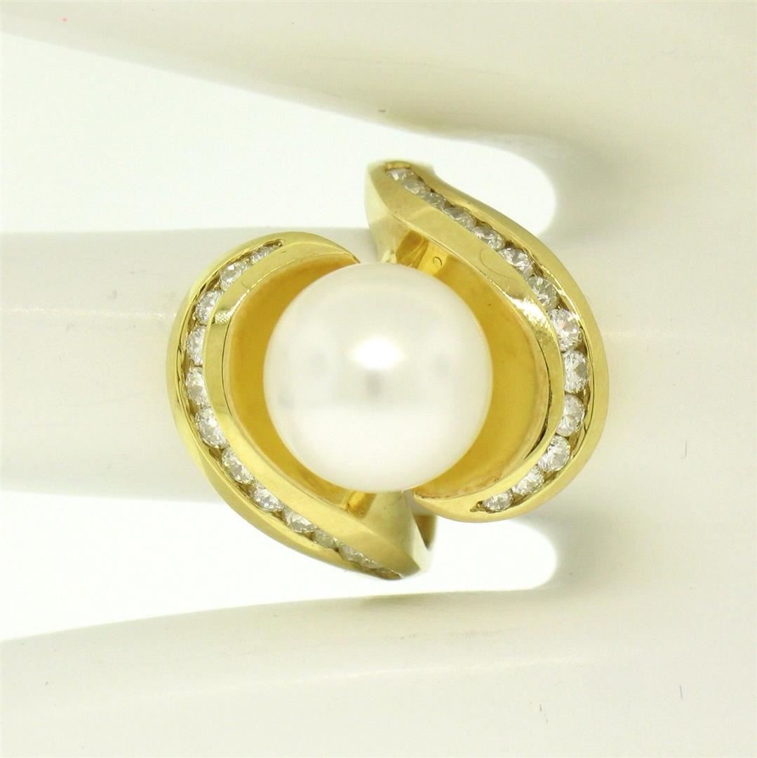 An estate solid 18k yellow gold cocktail ring, featuring 1 natural south sea pearl (10.60mm), with 26 round brilliant cut natural diamonds (F - VS1 ; 1.00ctw). The ring is size 7.0, weighs a total of 12.2 grams, and measures 20.74mm wide.
