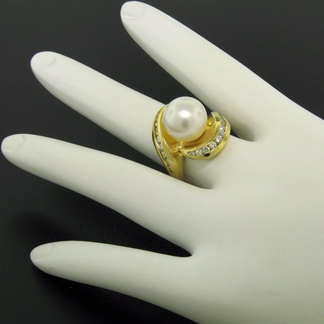 An estate solid 18k yellow gold cocktail ring, featuring 1 natural south sea pearl (10.60mm), with 26 round brilliant cut natural diamonds (F - VS1 ; 1.00ctw). The ring is size 7.0, weighs a total of 12.2 grams, and measures 20.74mm wide.