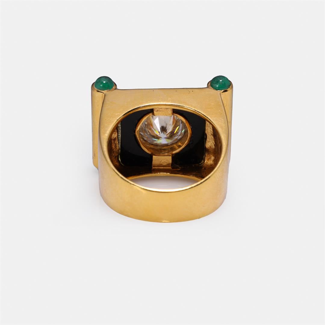 Large 18k yellow gold ring designed by Carlo Rici; the table with flat black onyx square centered with large round cut moissanite, then ends of the square terminating into scroll ends, each capped with bright green emeralds cabochons, marked 750 RICI to i