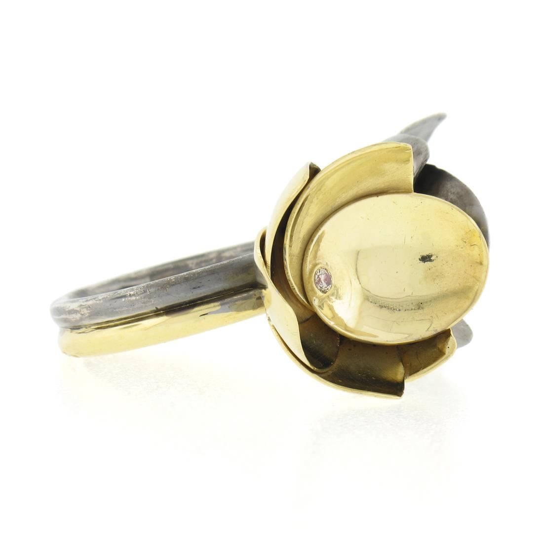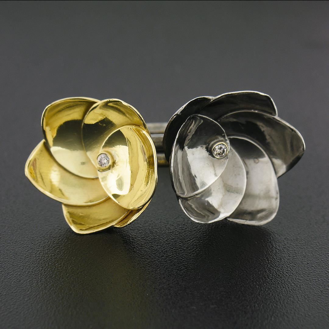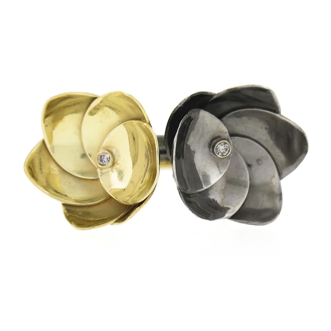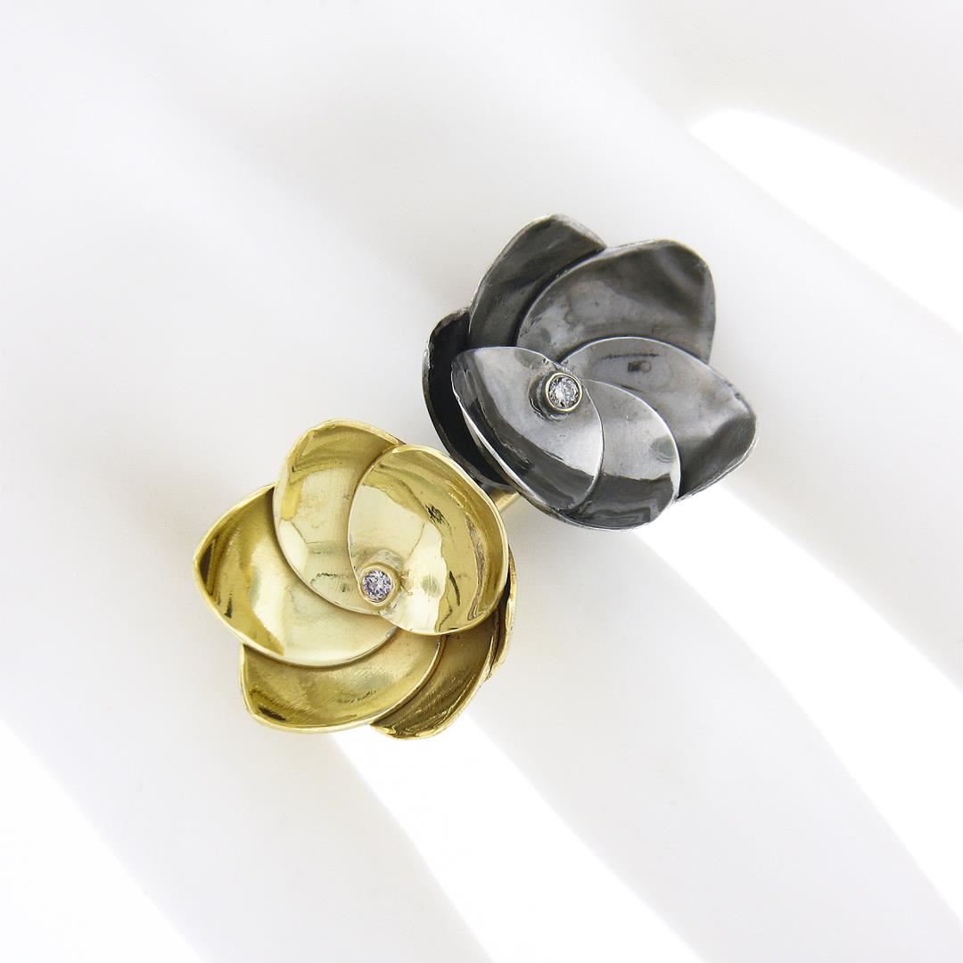 A solid 18k yellow gold & silver flower ring, with 2 round cut natural diamonds (0.04ctw). The ring is size 6.5, weighs a total of 12.12 grams, and measures 16mm wide.