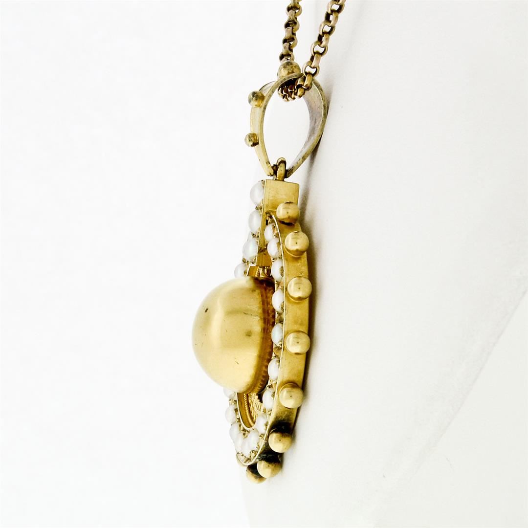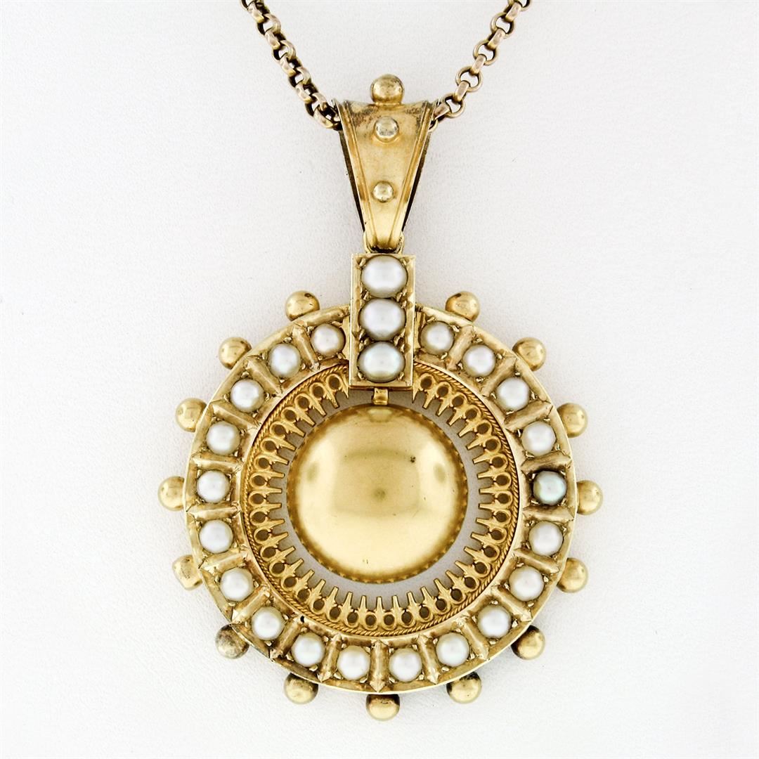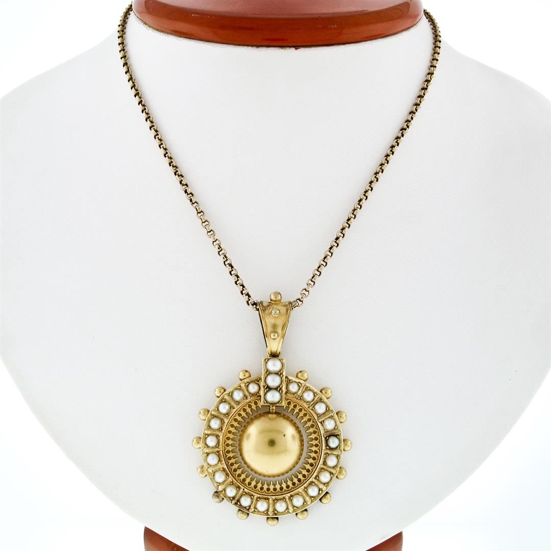 A large, Victorian era, solid 15k yellow gold pendant with 3 half round white cultured pearls (3.9mm) and 20 half round white to gray cultured pearls (2.7mm). 17 inch rolo link chain, 14.3 grams total weight, pendant measures 56.04x38.44mm.