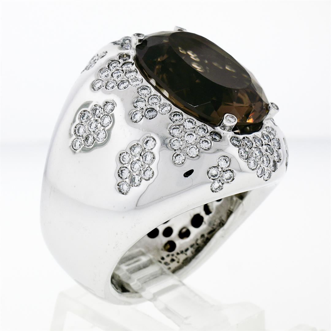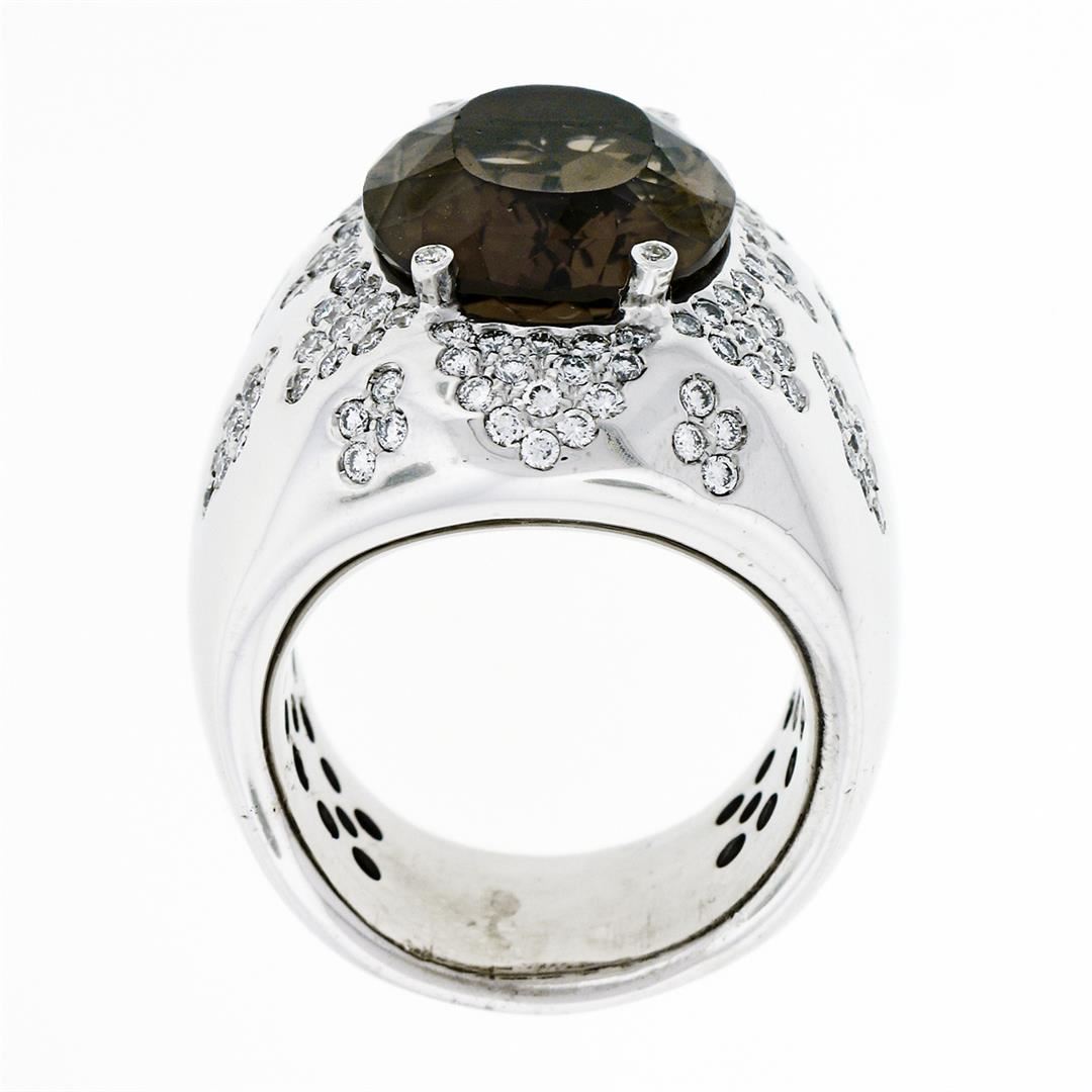 An estate solid 18k whte gold cocktail ring, with 1 oval cut natural smoky quartz (18.75x14.20mm), and 134 round brilliant cut natural diamonds (G/H- VS1/VS2 ; 2.50ctw). The ring is size 10, weighs a total of 30.85 grams, and measures 28.25mm wide.