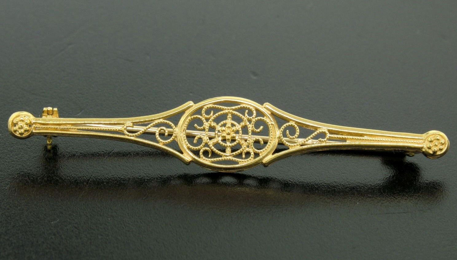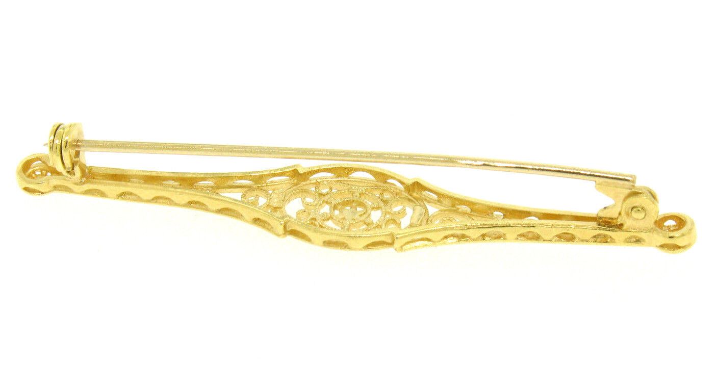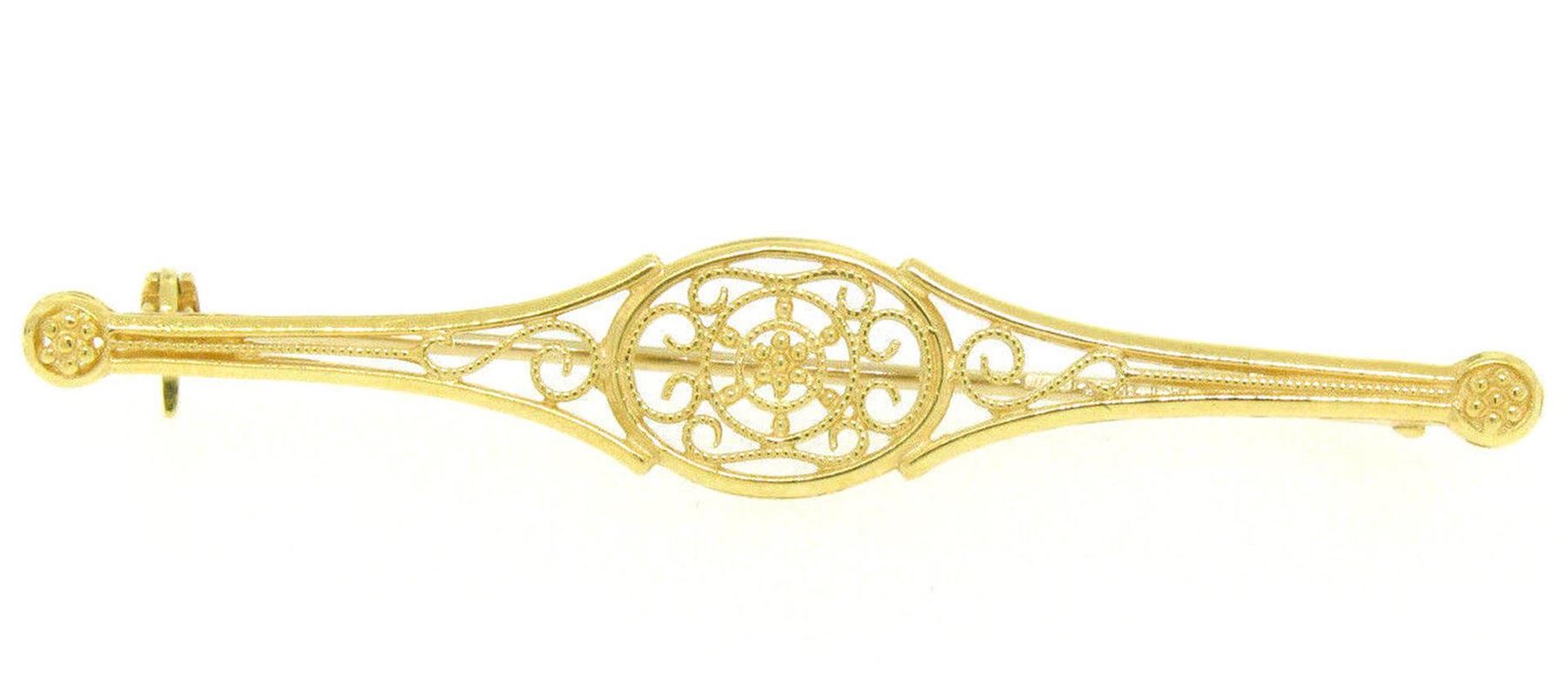 An estate solid 18k yellow gold filigree bar pin brooch. Measures 9.79x56.53mm and weighs a total of 4.2 grams.