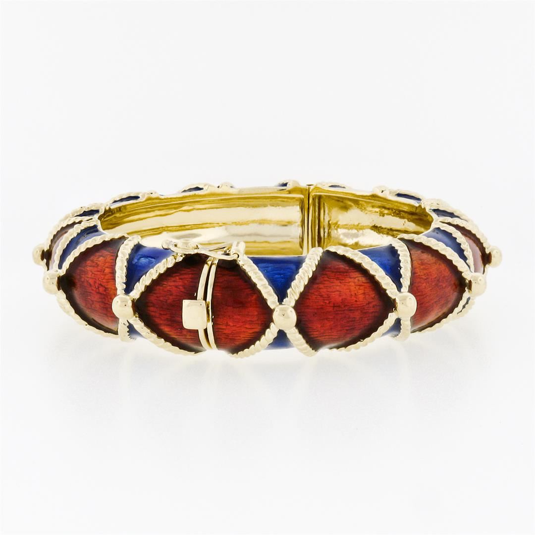 A vintage solid 14k yellow gold bangle bracelet, with red and blue enamel work. It weighs a total of 85.65 grams, measures 37.50mm wide, and measures 7 inches in length.