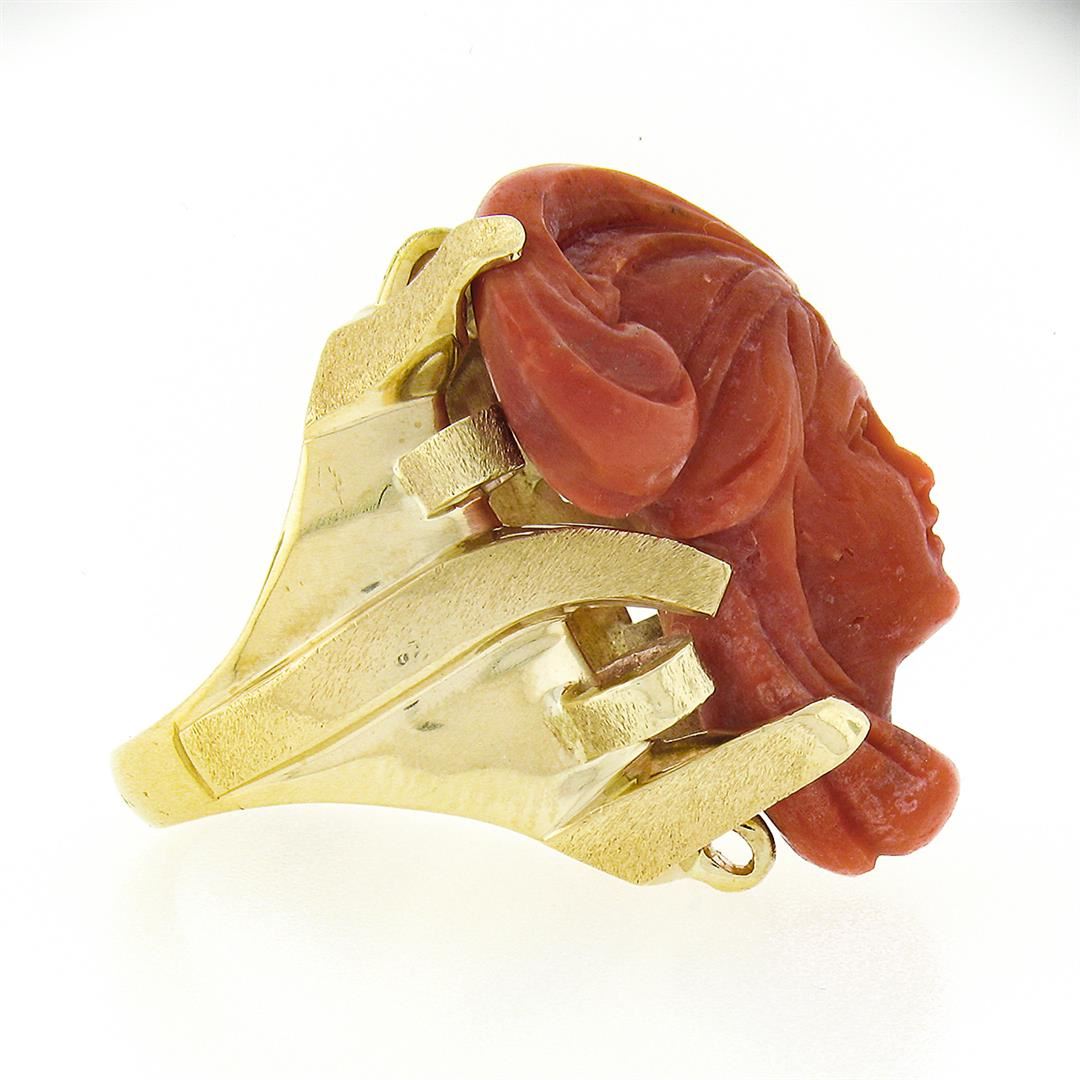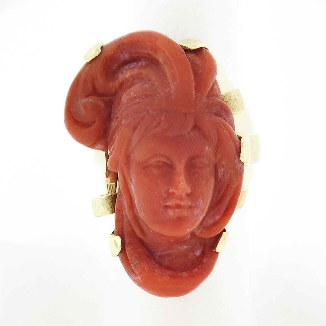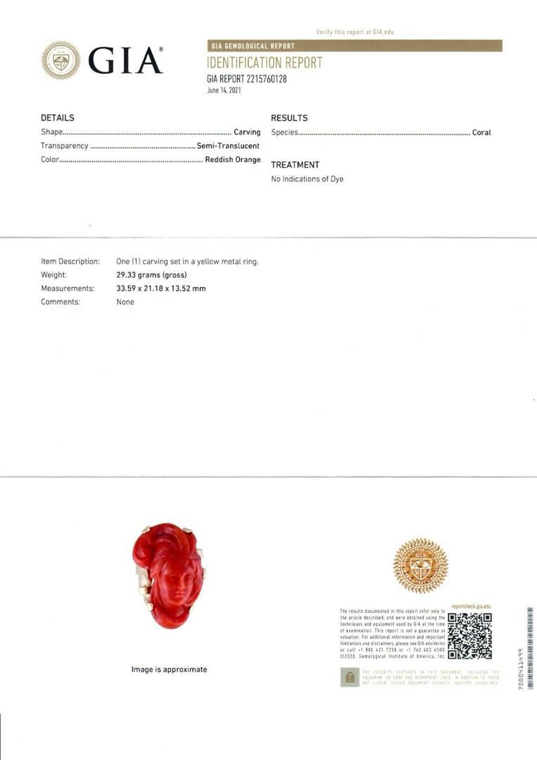 A solid 14k yellow gold statement ring, with 1 Gia certified carved cameo lady face natural coral (29.33 grams). The ring is size 7.5, weighs a total of 29.33 grams, and measures 33.55mm wide. Comes with all original relevant certifications.