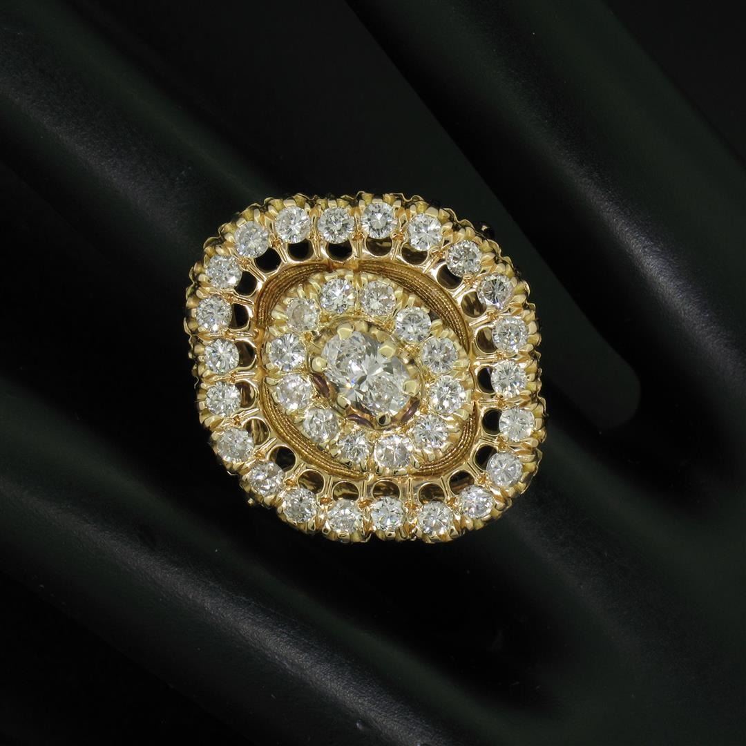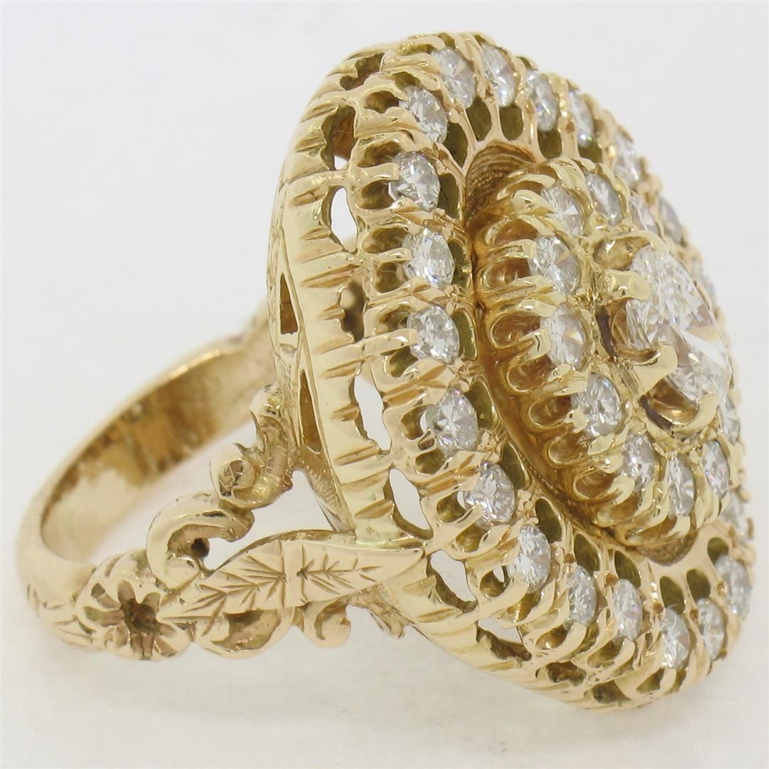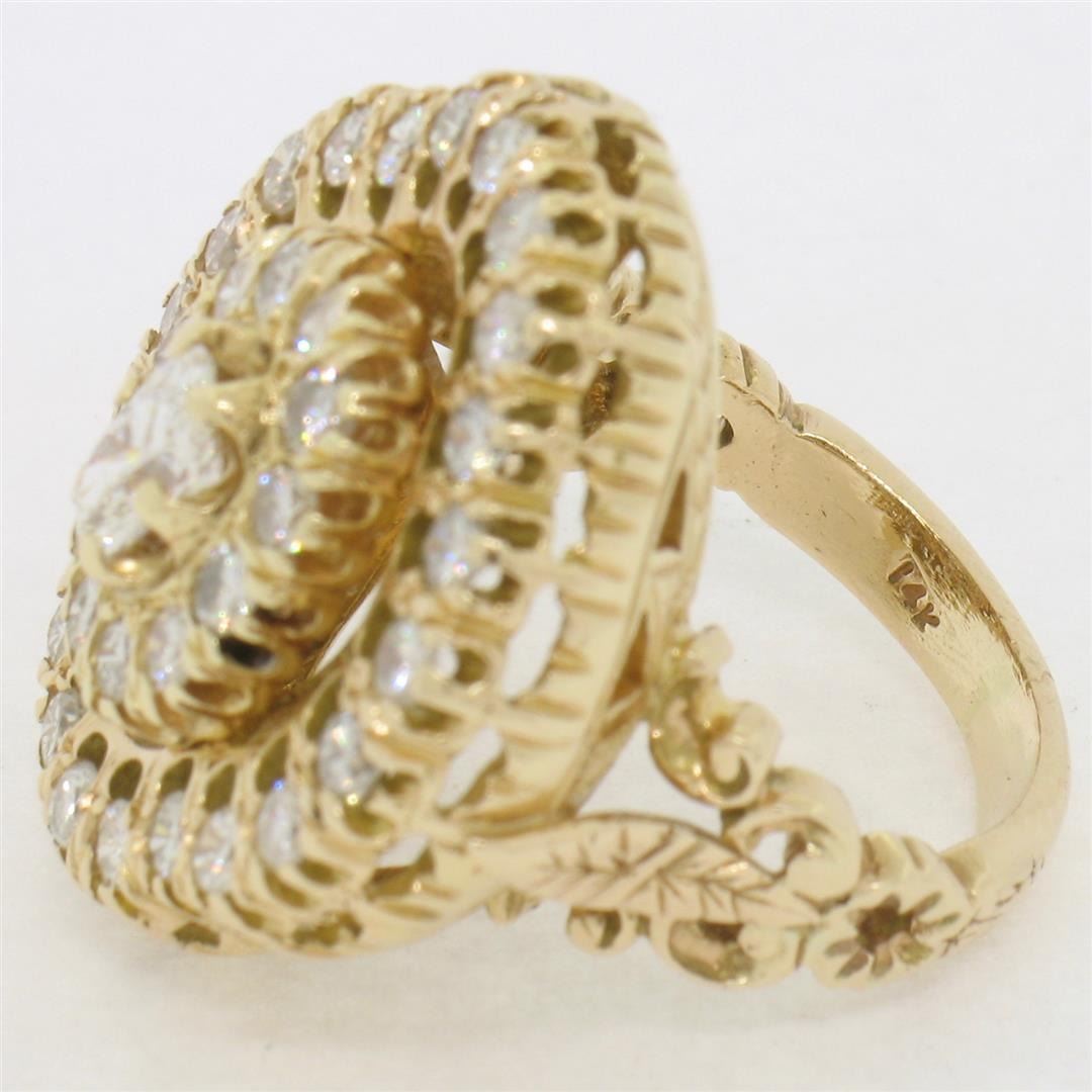 A vintage solid 14k yellow gold large flower cocktail ring, with 1 oval cut natural diamond (G- VS1; 0.50ct), surrounded with 34 round brilliant cut natural diamonds (F/G - SI1/SI2; 1.70ctw). The ring is size 5.0, weighs a total of 12.70 grams, and measures 25.0mm wide.
