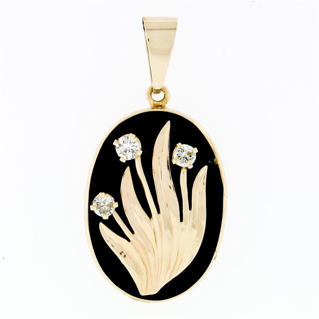 A vinatge solid 14k yellow gold pendant, with 1 oval cut natural black onyx (27.80x19.80mm), and 3 round brilliant cut natural diamonds (H/I - VS2/SI1 ; 0.44ctw). The pendant weighs a total of 7.4 grams, measures 42.75x21.30mm including the bail, and the inside of the bail measures 9.30x4.55mm.