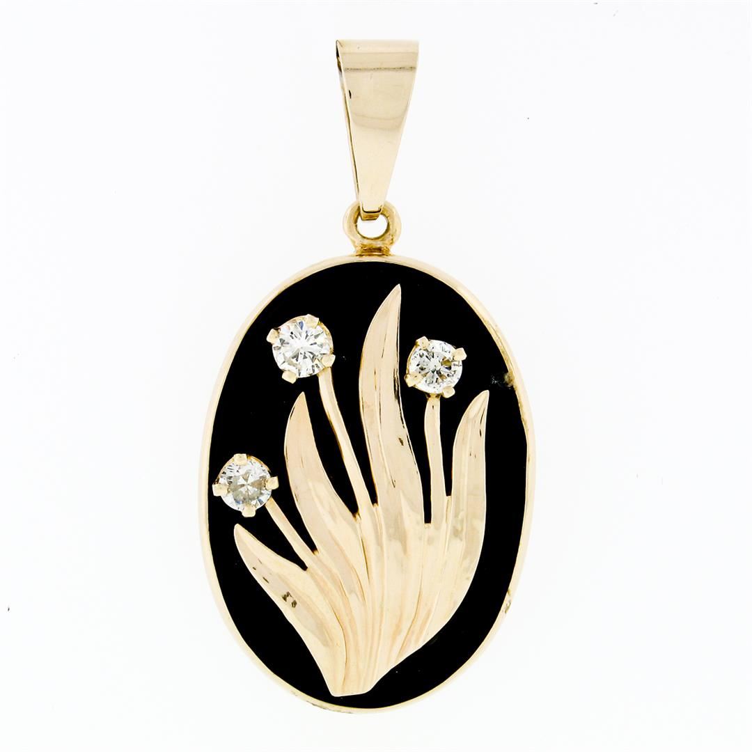Large Vintage 14K Yellow Gold .44 ctw Diamond & Onyx Tulip Flower Bouquet Pendan