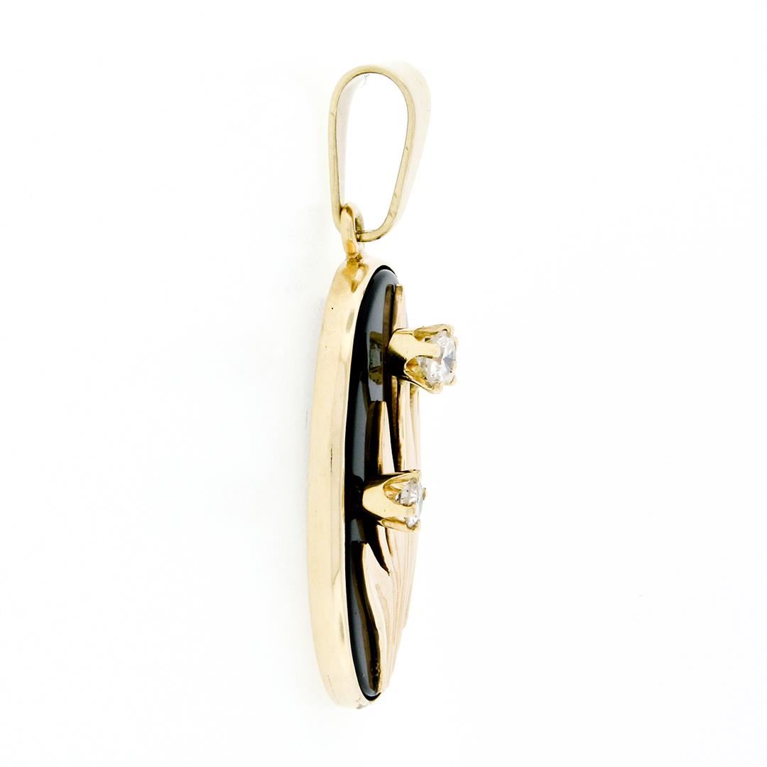 A vinatge solid 14k yellow gold pendant, with 1 oval cut natural black onyx (27.80x19.80mm), and 3 round brilliant cut natural diamonds (H/I - VS2/SI1 ; 0.44ctw). The pendant weighs a total of 7.4 grams, measures 42.75x21.30mm including the bail, and the inside of the bail measures 9.30x4.55mm.