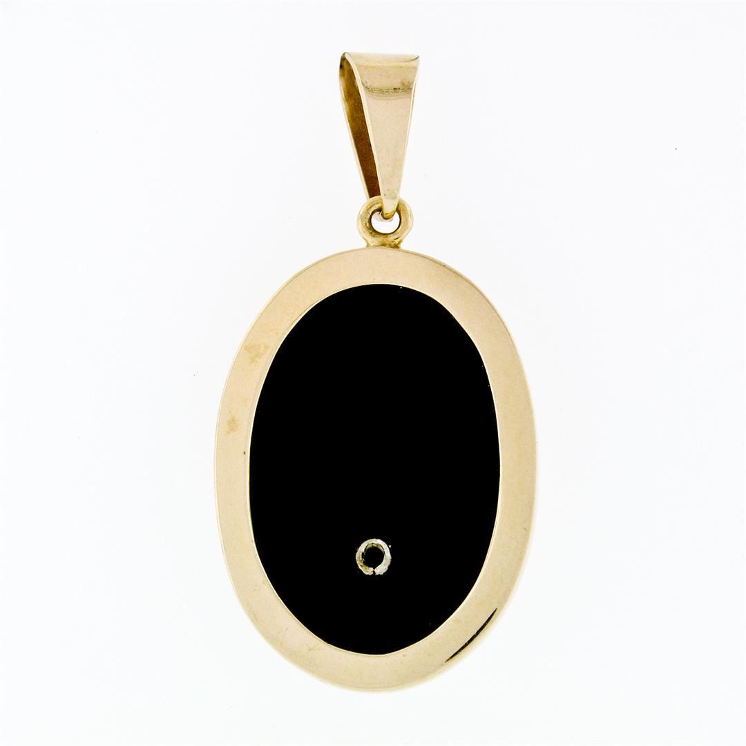 A vinatge solid 14k yellow gold pendant, with 1 oval cut natural black onyx (27.80x19.80mm), and 3 round brilliant cut natural diamonds (H/I - VS2/SI1 ; 0.44ctw). The pendant weighs a total of 7.4 grams, measures 42.75x21.30mm including the bail, and the inside of the bail measures 9.30x4.55mm.