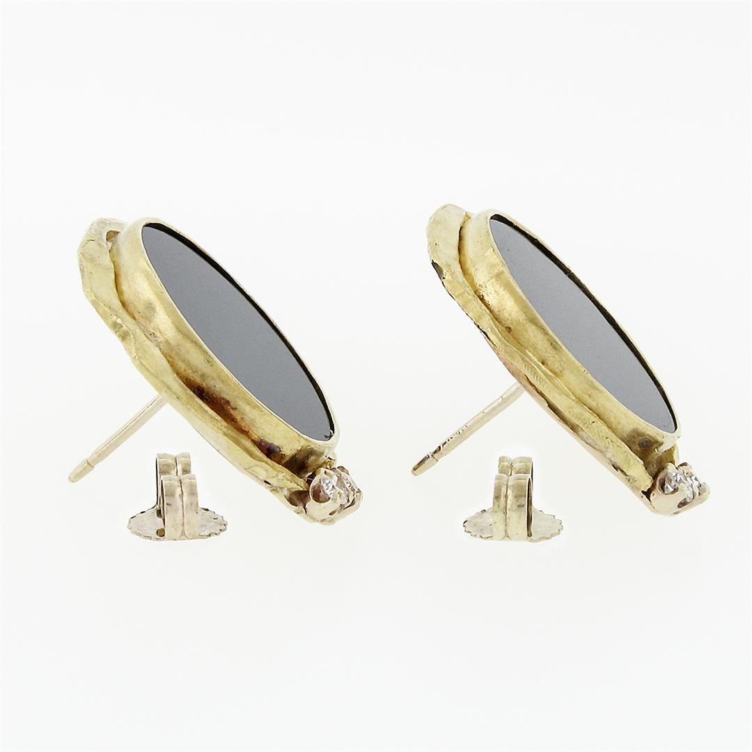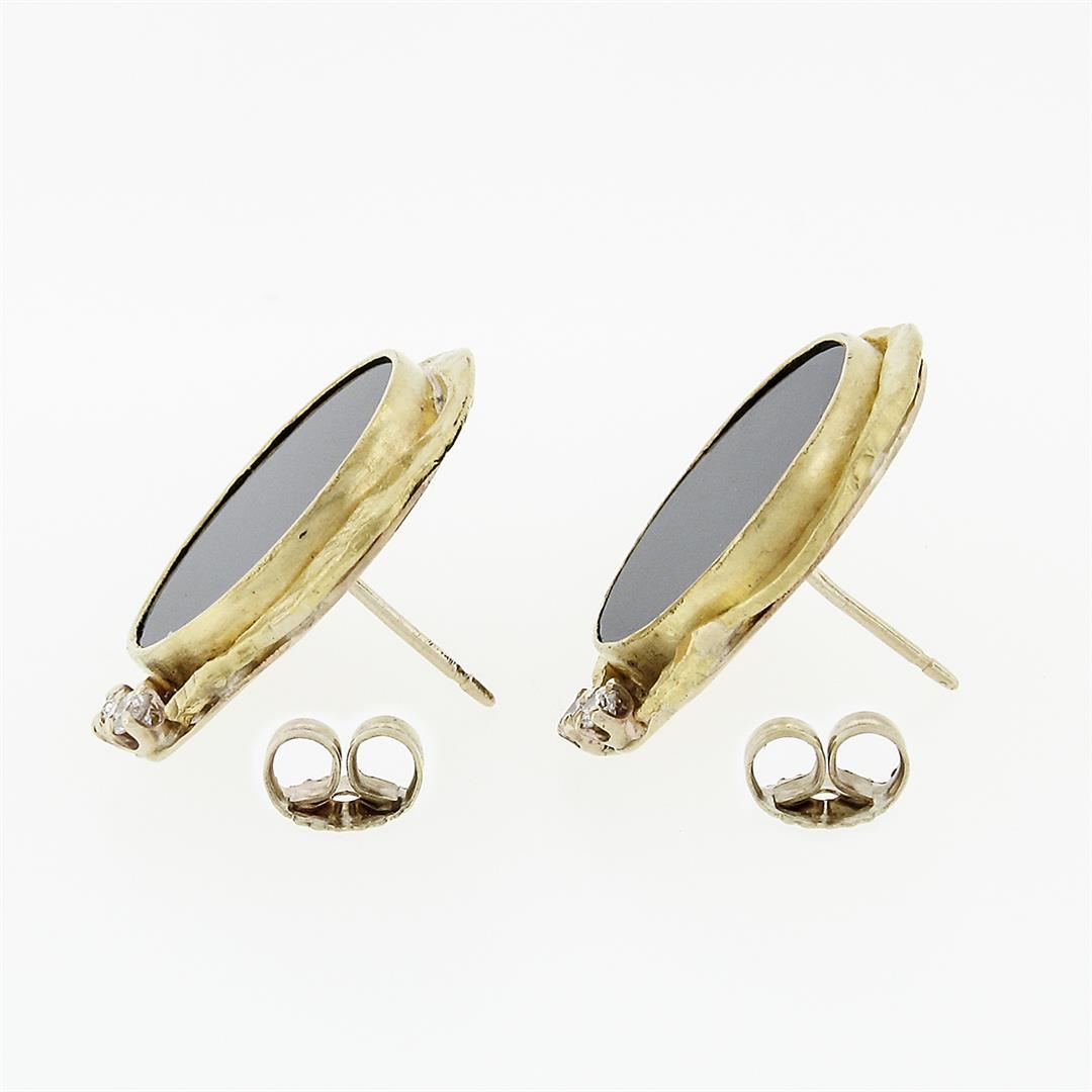 A vintage solid 14K & 22K yellow gold pair of earrings, with 2 round cut natural black onyx (15.25mm), & 4 round brilliant cut natural diamonds (F- VS1; 0.14ctw). The earrings measure approximately 21.75mm in diameter and weigh a total of 9.32 grams.