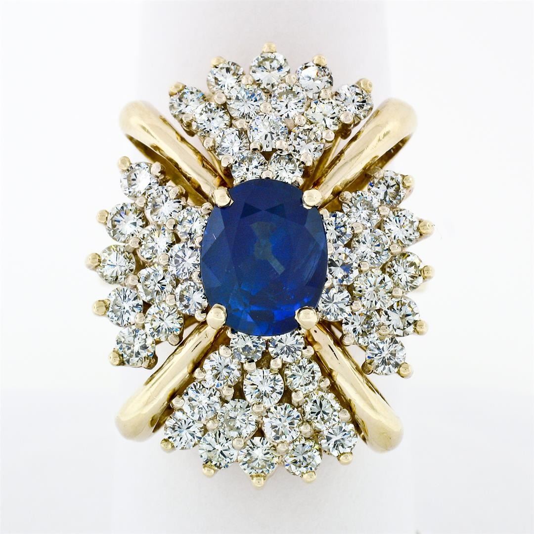 A vintage solid 14k yellow gold statement ring with a GIA certified oval ceylon sapphire (3.18ct) and 52 natural diamonds (I/J - VS1/VS2; 3.06ctw). The ring is size 9.0, weighs a total of 15.33 grams, and measures 28.77mm wide. Comes with all original relevant certifications.