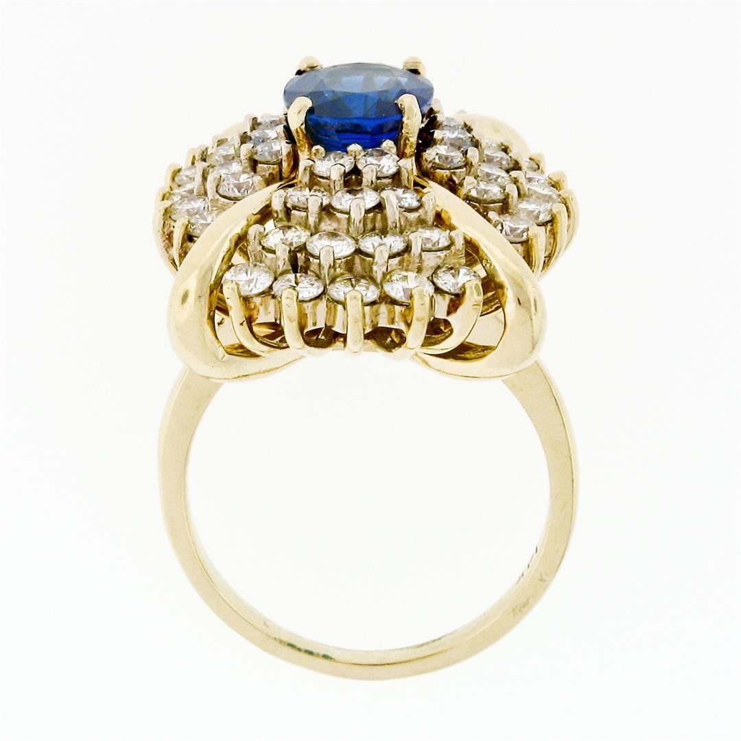 A vintage solid 14k yellow gold statement ring with a GIA certified oval ceylon sapphire (3.18ct) and 52 natural diamonds (I/J - VS1/VS2; 3.06ctw). The ring is size 9.0, weighs a total of 15.33 grams, and measures 28.77mm wide. Comes with all original relevant certifications.