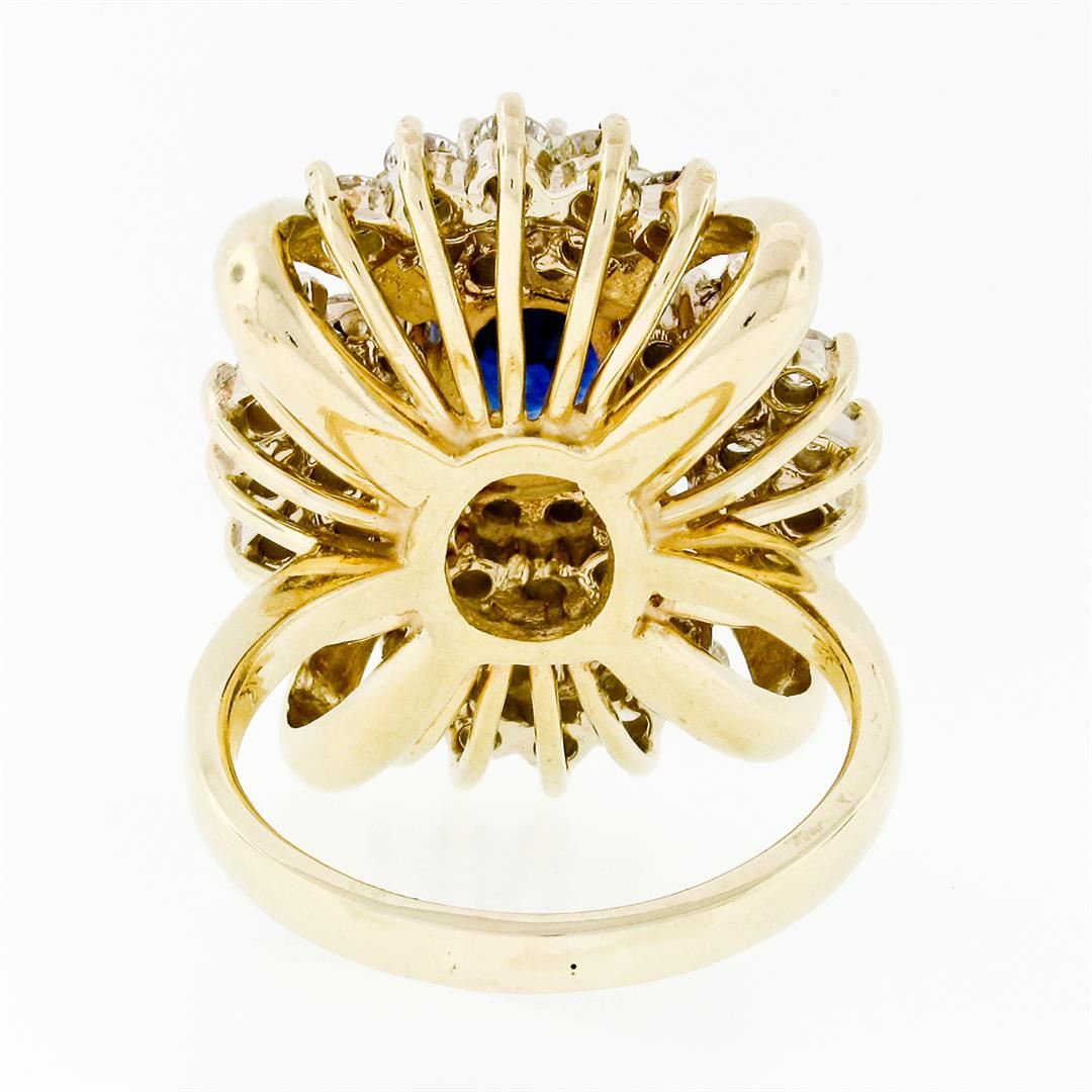 A vintage solid 14k yellow gold statement ring with a GIA certified oval ceylon sapphire (3.18ct) and 52 natural diamonds (I/J - VS1/VS2; 3.06ctw). The ring is size 9.0, weighs a total of 15.33 grams, and measures 28.77mm wide. Comes with all original relevant certifications.