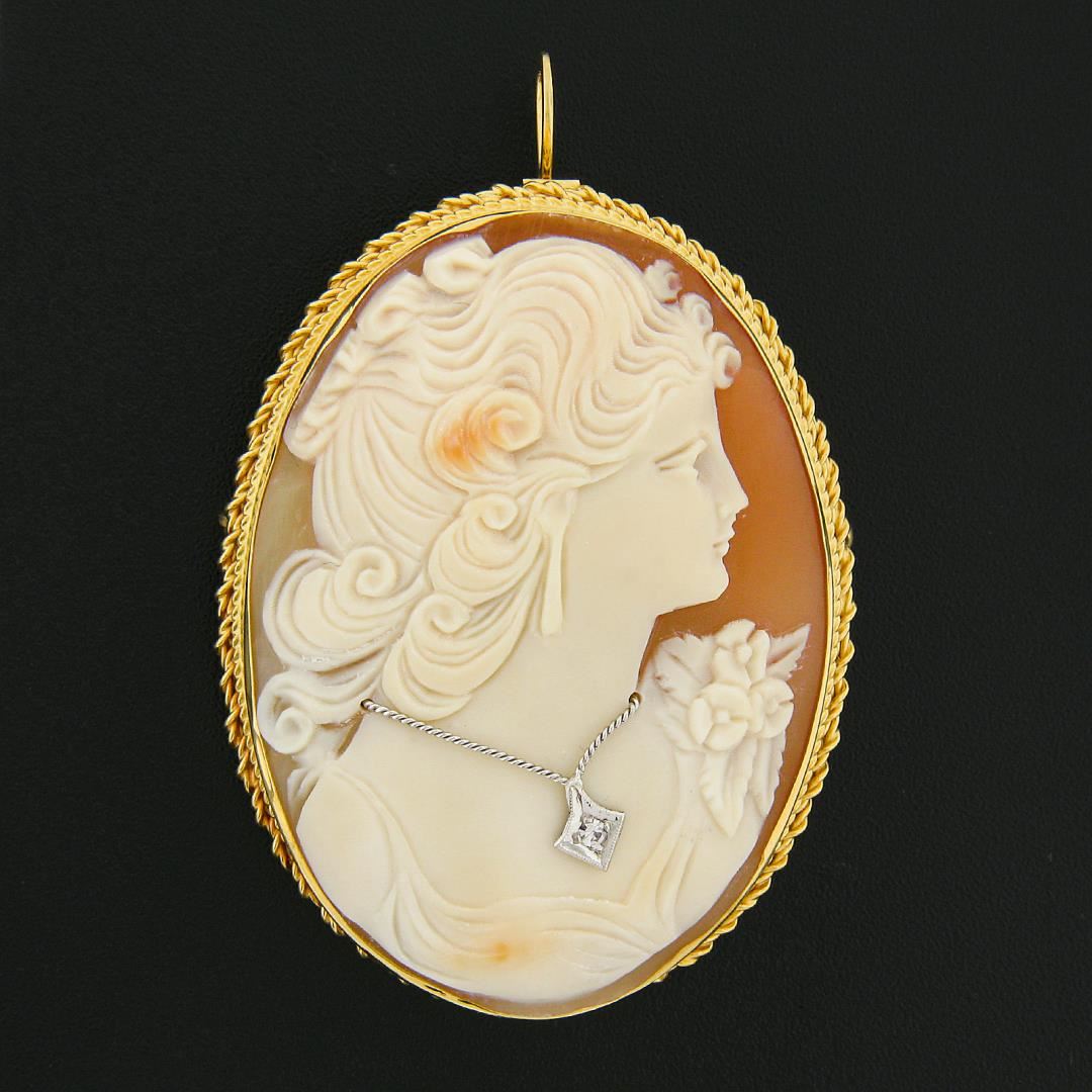A vintage solid 14k yellow & white gold brooch pendant, featuring 1 oval shape carved shell cameo (48.5x35.1mm), and 1 old single cut natural diamond (G - VS2 ; 0.03ct). Measures 60x39.8mm and weighs a total of 15.28 grams, and inside bail measures 5.5x3.4mm.