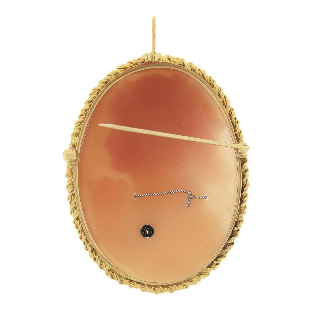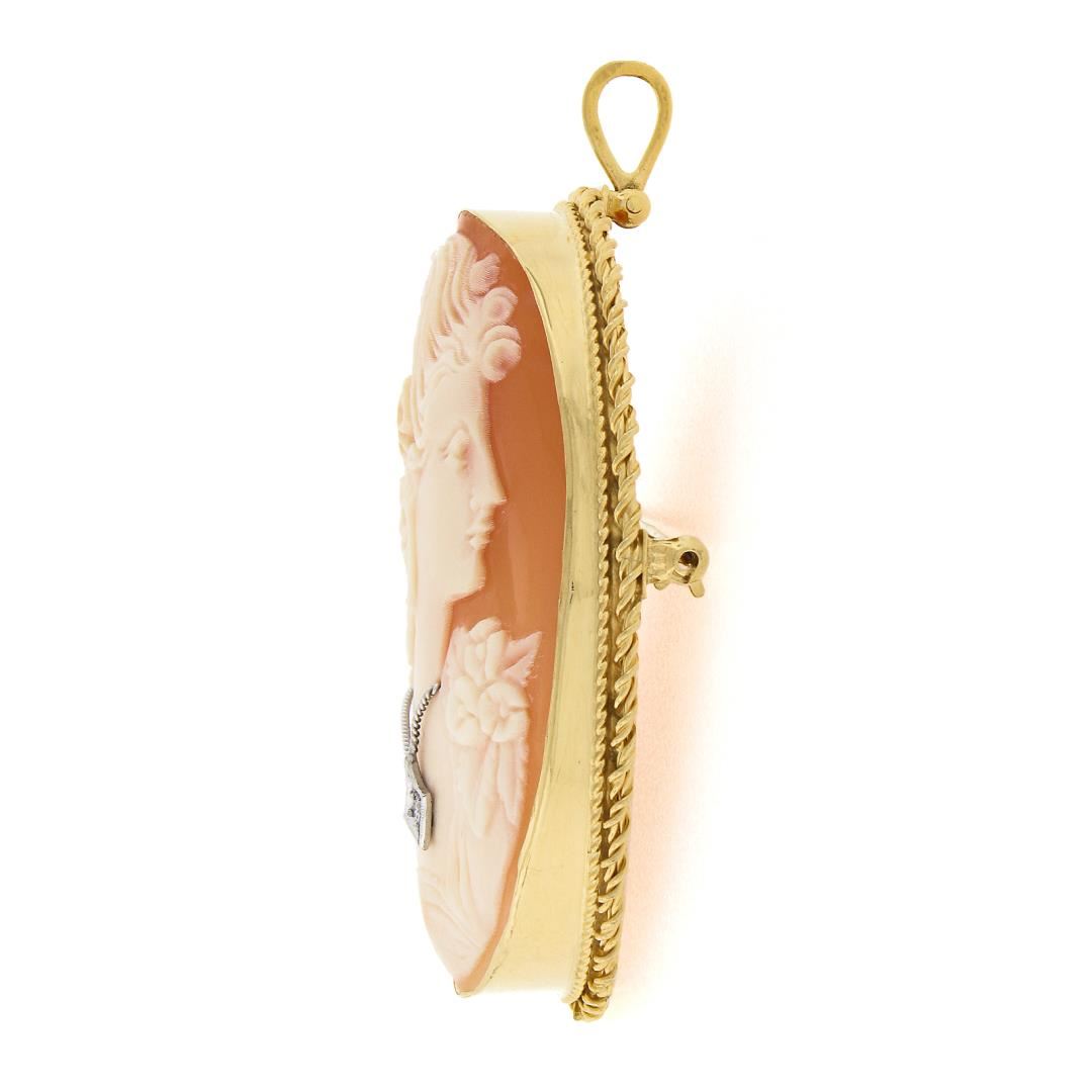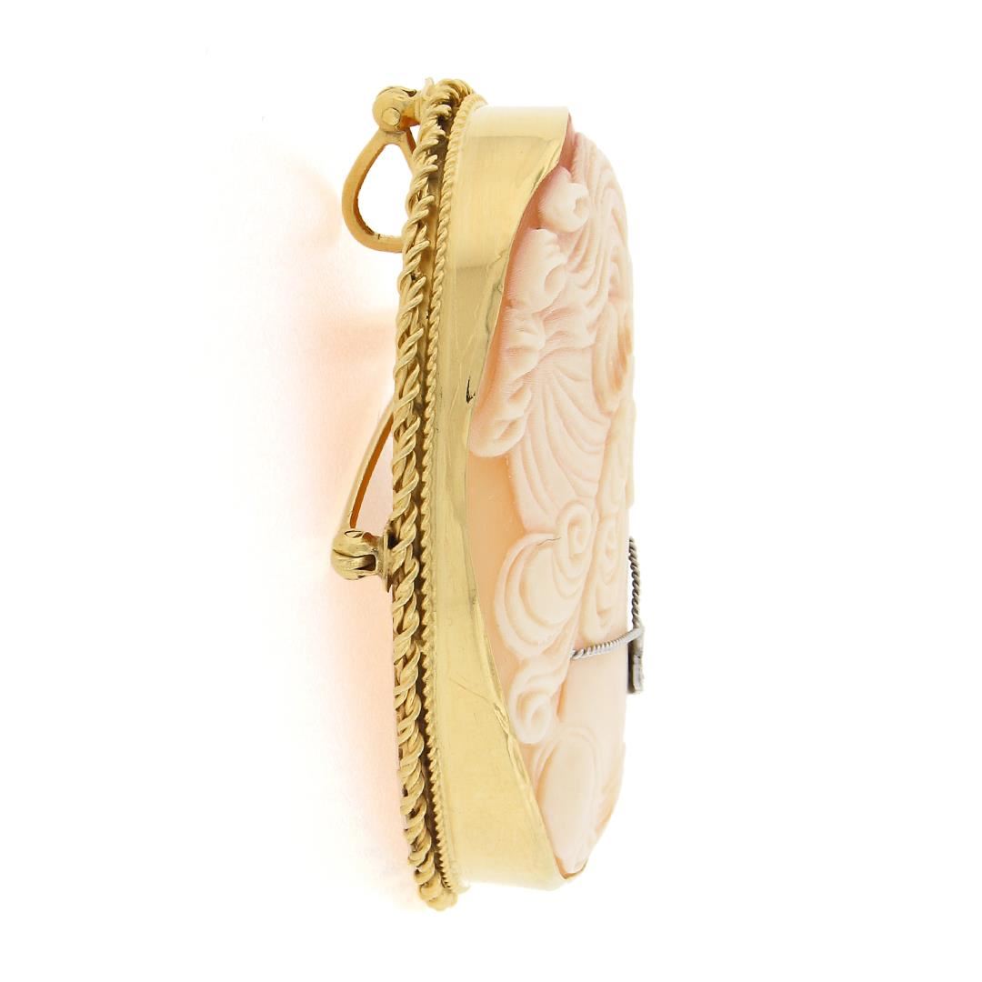 A vintage solid 14k yellow & white gold brooch pendant, featuring 1 oval shape carved shell cameo (48.5x35.1mm), and 1 old single cut natural diamond (G - VS2 ; 0.03ct). Measures 60x39.8mm and weighs a total of 15.28 grams, and inside bail measures 5.5x3.4mm.