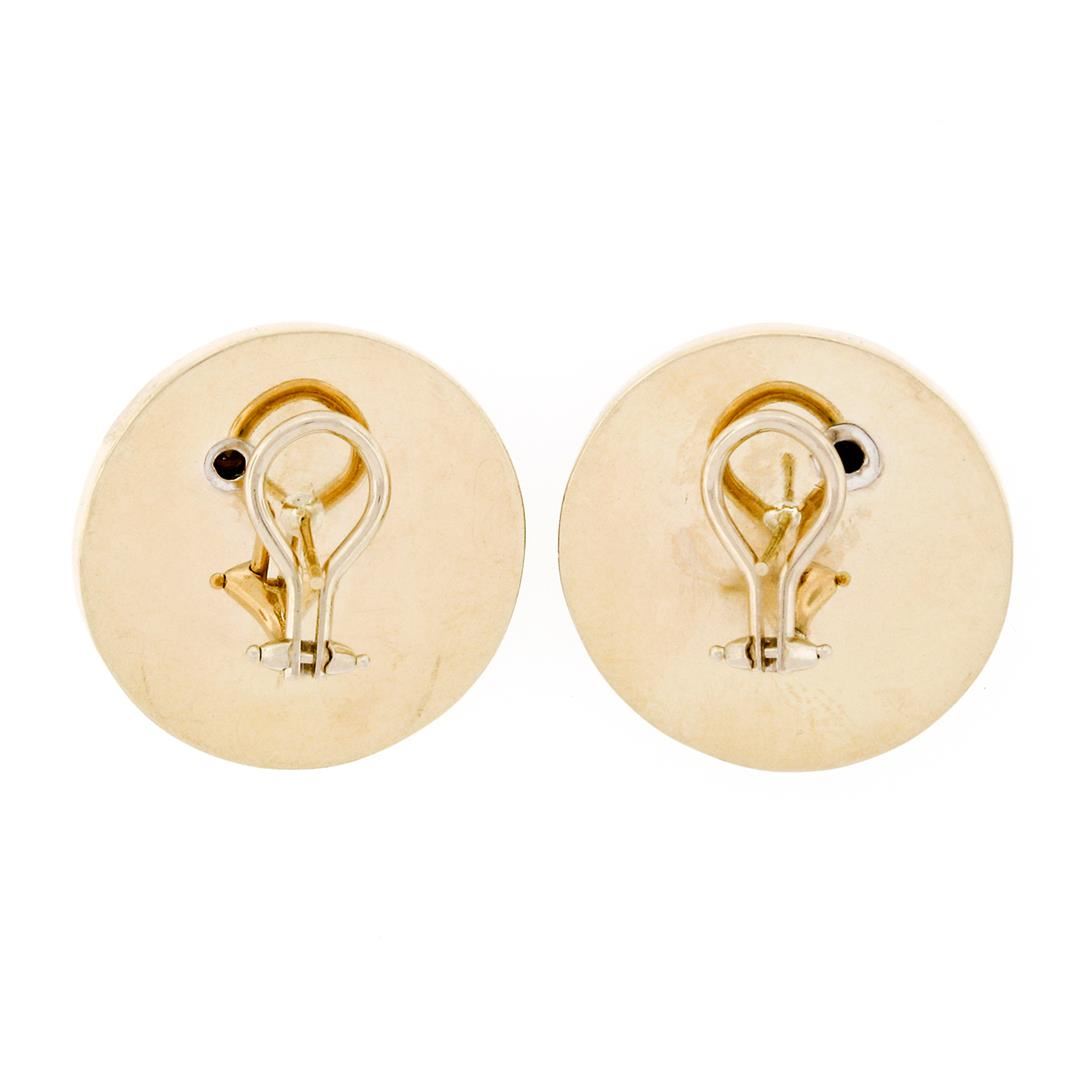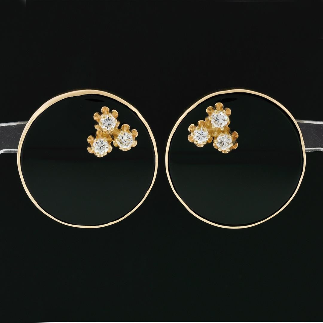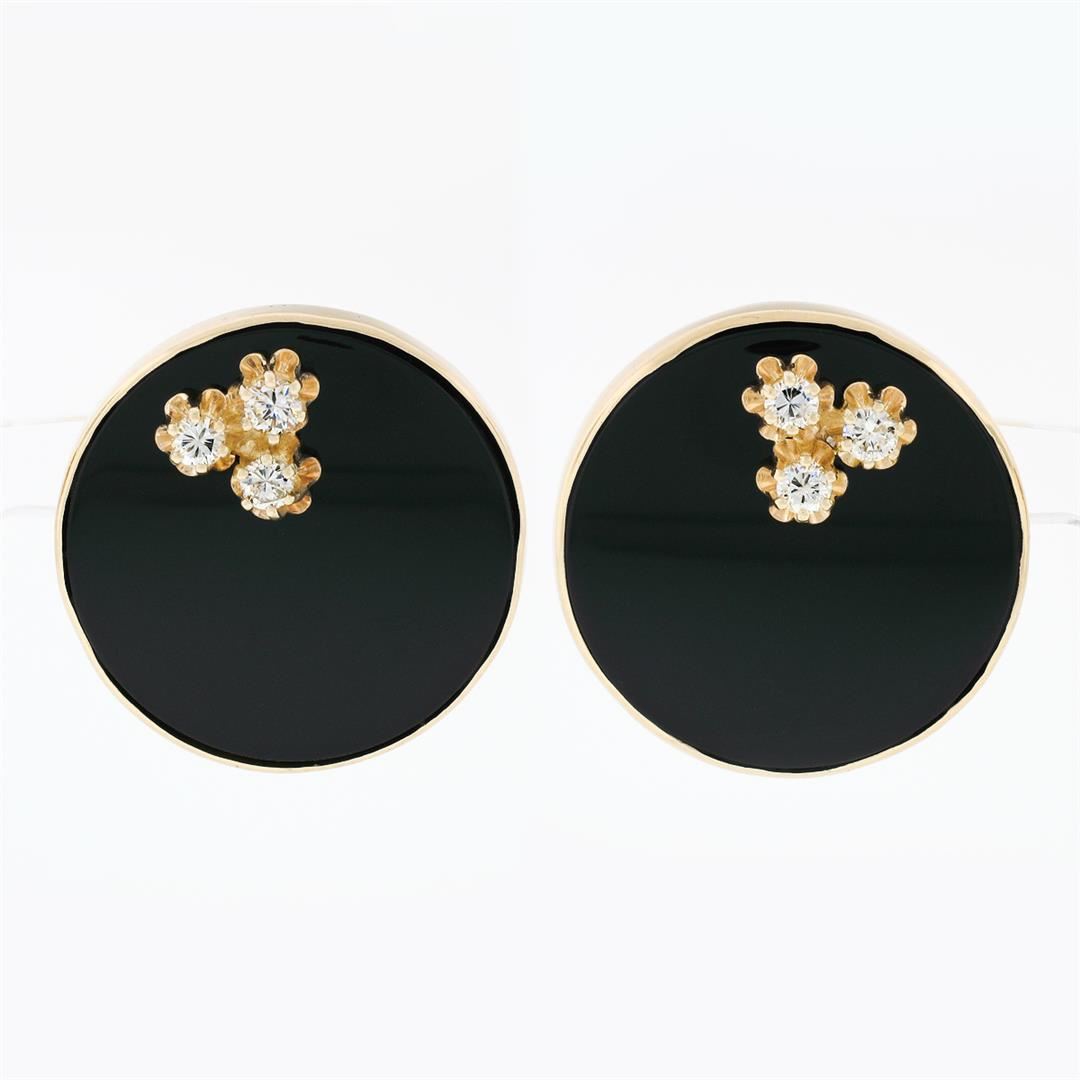 A vintage solid 14k yellow gold button earrings, with 2 round cabochon cut natural black onyx (24.40mm), and 6 old transitional cut natural diamonds (G/H - VS1/VS2 ; 0.60ctw). The earrings measure approximately 26.0mm in diameter and weigh a total of 20.26 grams.