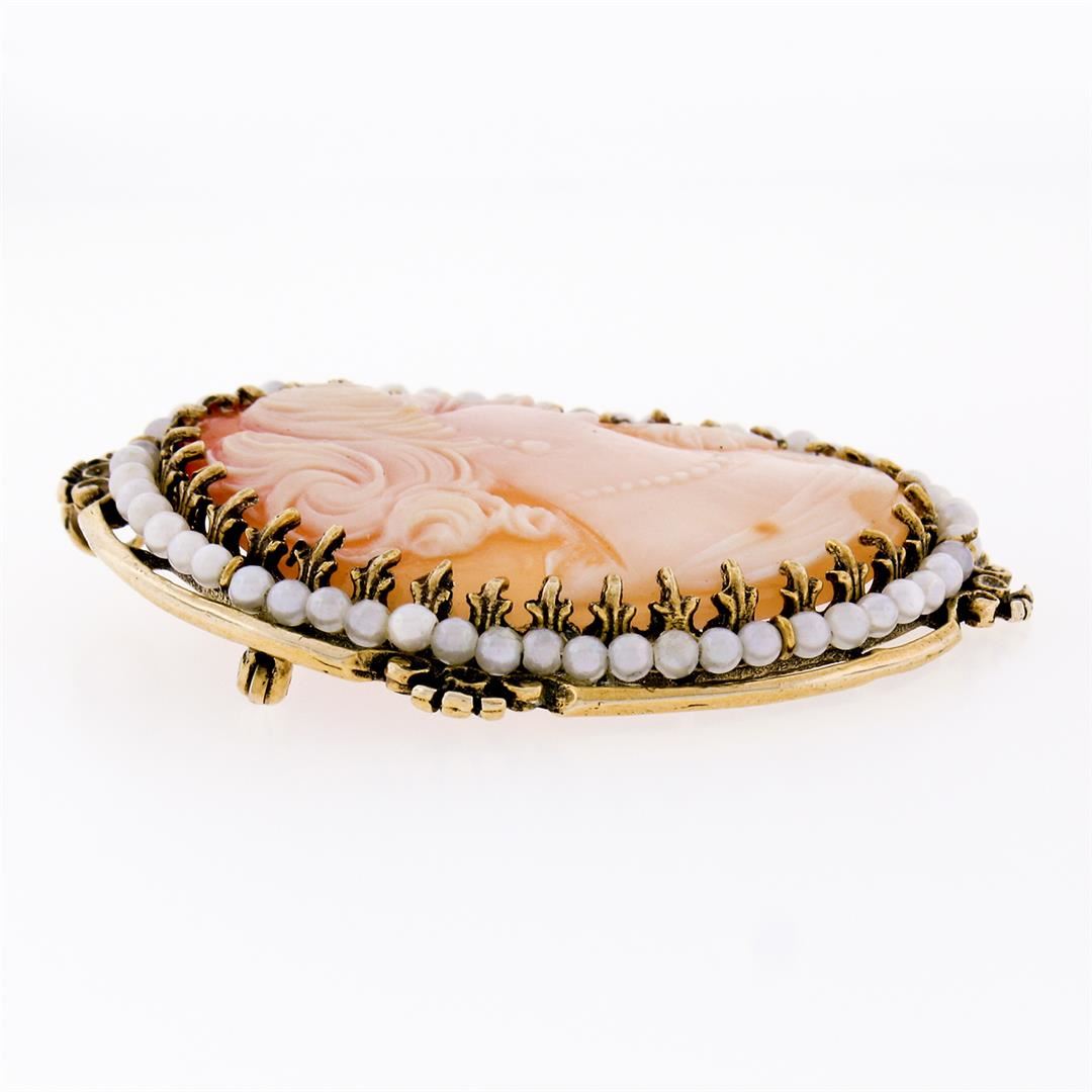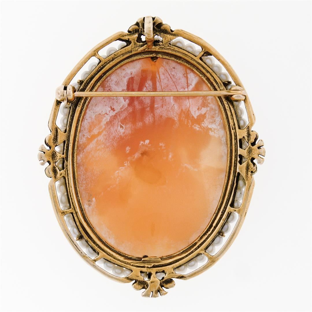 Large Vintage 14k Yellow Gold Carved Shell Cameo Pearl Frame Halo Brooch Pendant