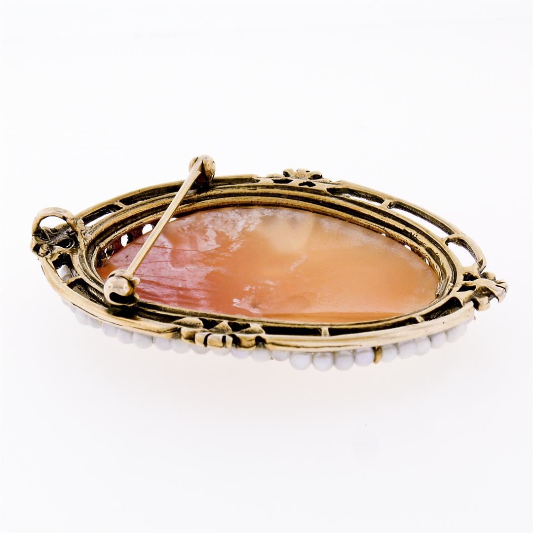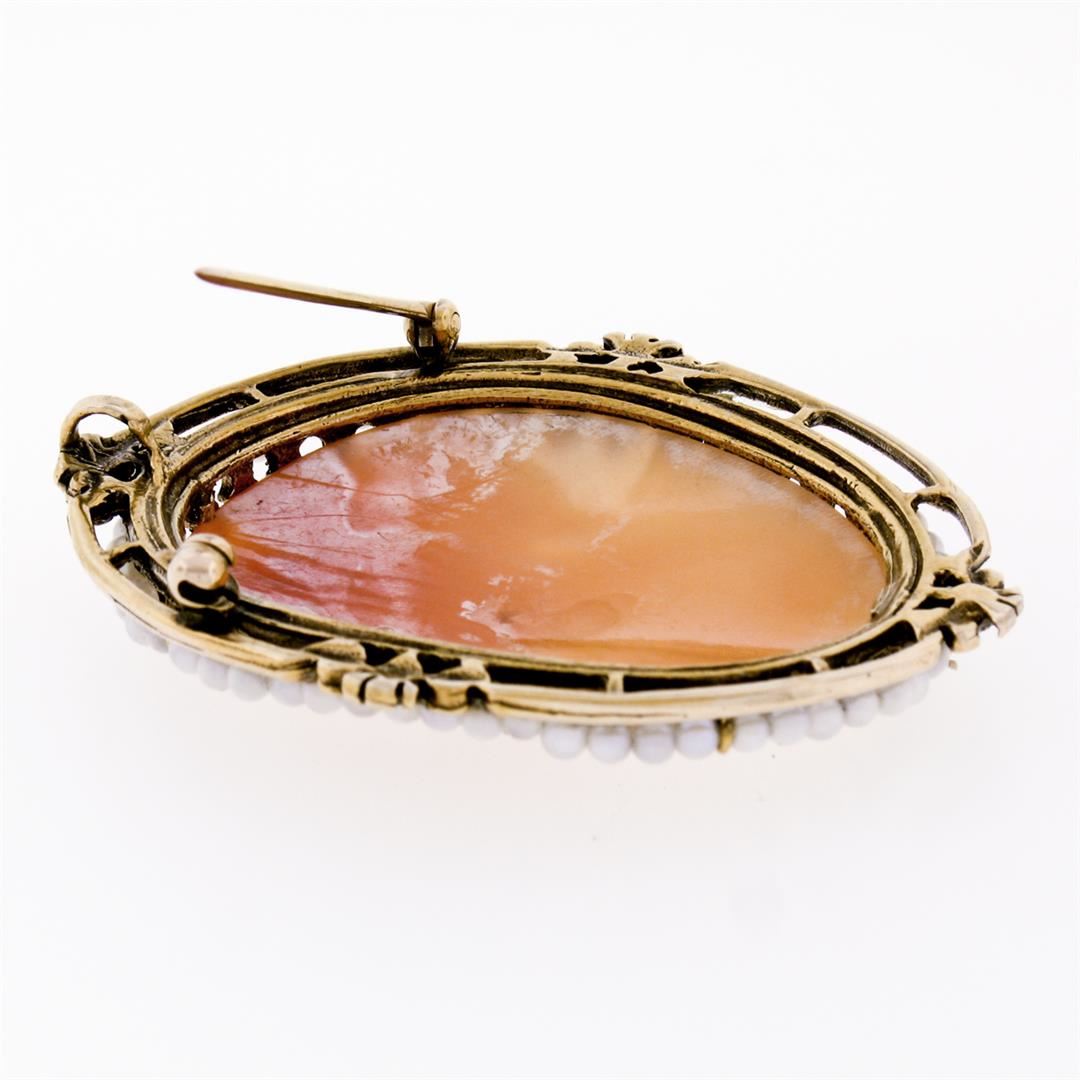 A vintage solid 14k yellow gold pin brooch, with 1 oval shape natural carved shell cameo (35.50x27.50mm), surrounded with a halo of 55 round shape natural pearls (2.0mm). Measures 48x38.50mm and weighs a total of 12.78 grams.
