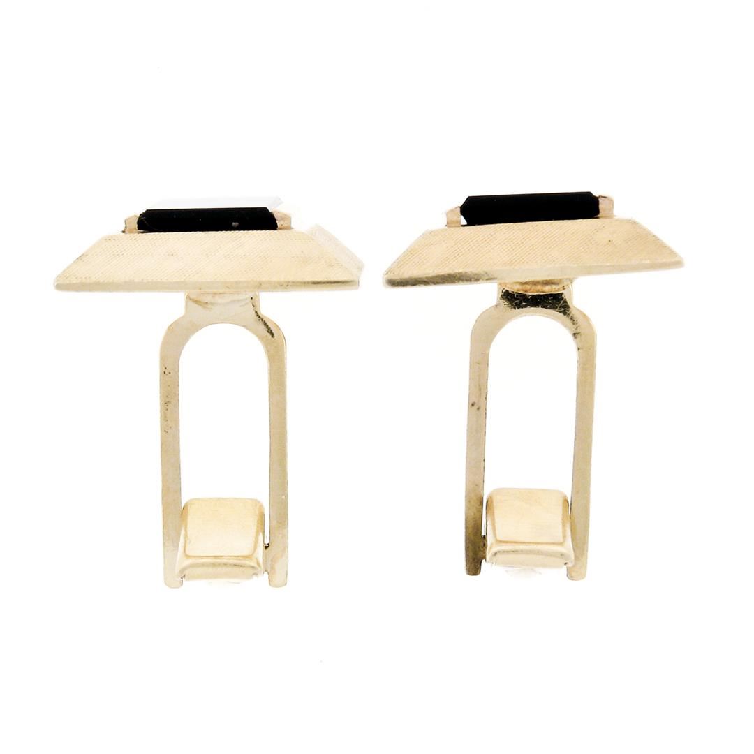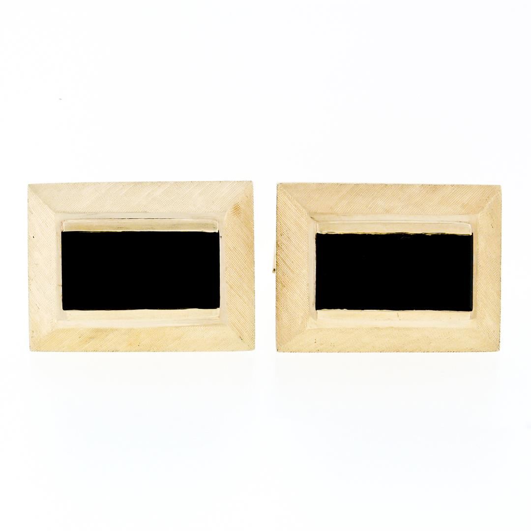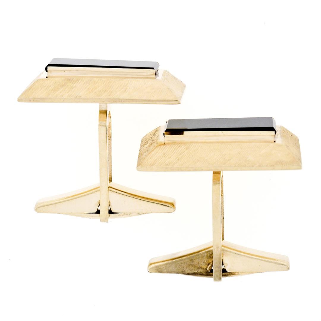A vintage solid 14k yellow gold cufflinks, with 2 rectangular flat natural black onyx (15.15x7.50mm). These cuff links have a swivel design with a clearance of 12mm, weigh a total of 15.47 grams, and the front panels measure 22x16.60mm.