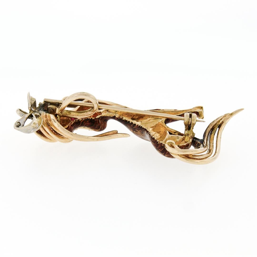 A vintage solid 18k yellow and white gold dog brooch pendant, with brown enamel work and 2 round cut natural rubies (0.10ctw), and 3 round single cut natural diamonds (G- VS2 ; 0.03ctw ). Measures 56.75x28.50mm and weighs a total of 18.75 grams.