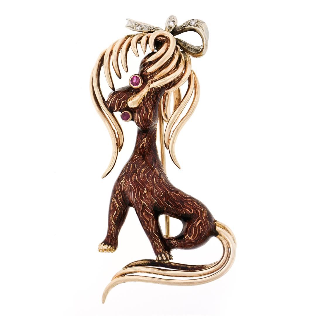 A vintage solid 18k yellow and white gold dog brooch pendant, with brown enamel work and 2 round cut natural rubies (0.10ctw), and 3 round single cut natural diamonds (G- VS2 ; 0.03ctw ). Measures 56.75x28.50mm and weighs a total of 18.75 grams.