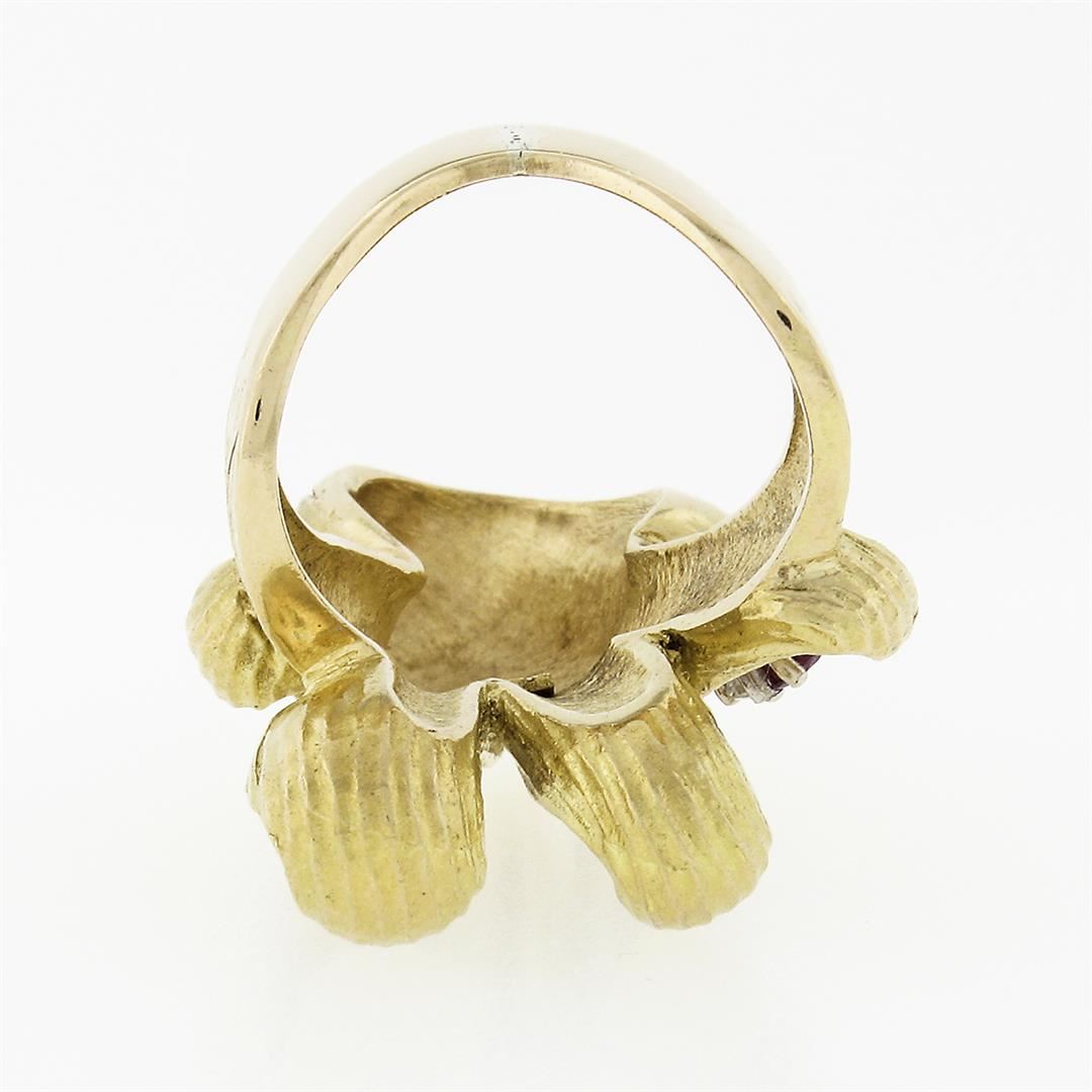 Large Vintage 18K Gold Ruby & Diamond Textured Overlap Multi Leaf Cocktail Ring