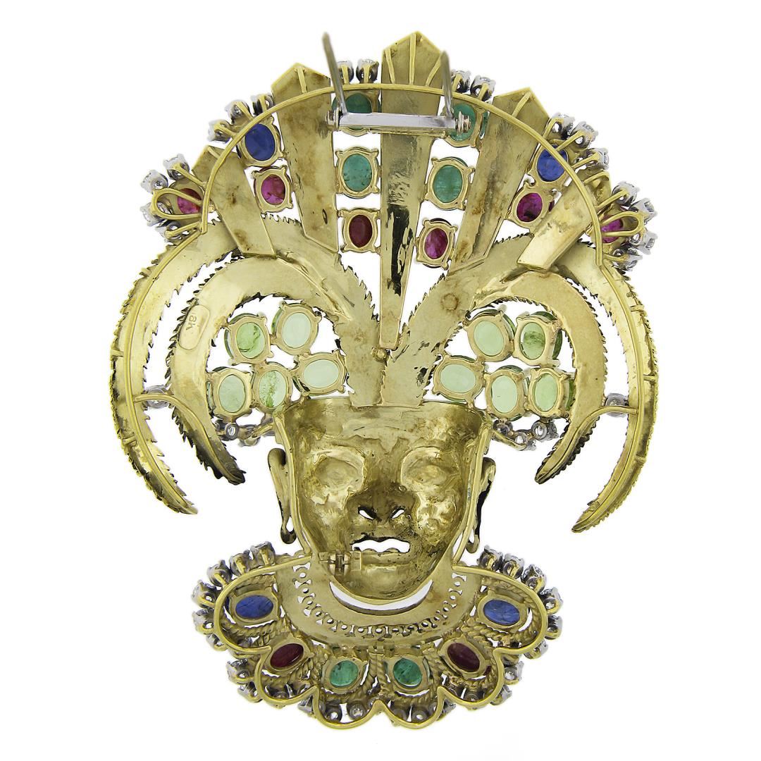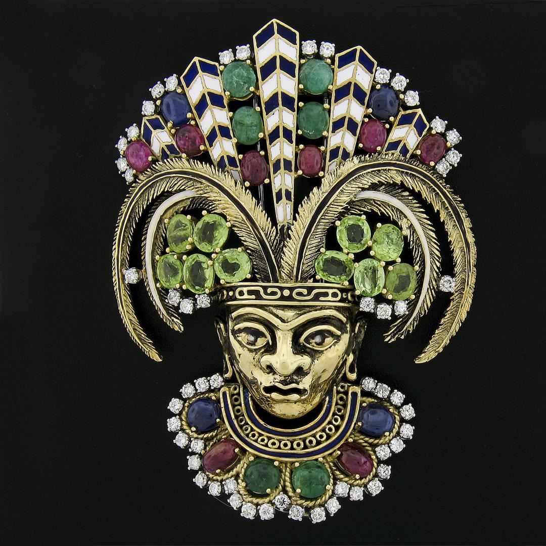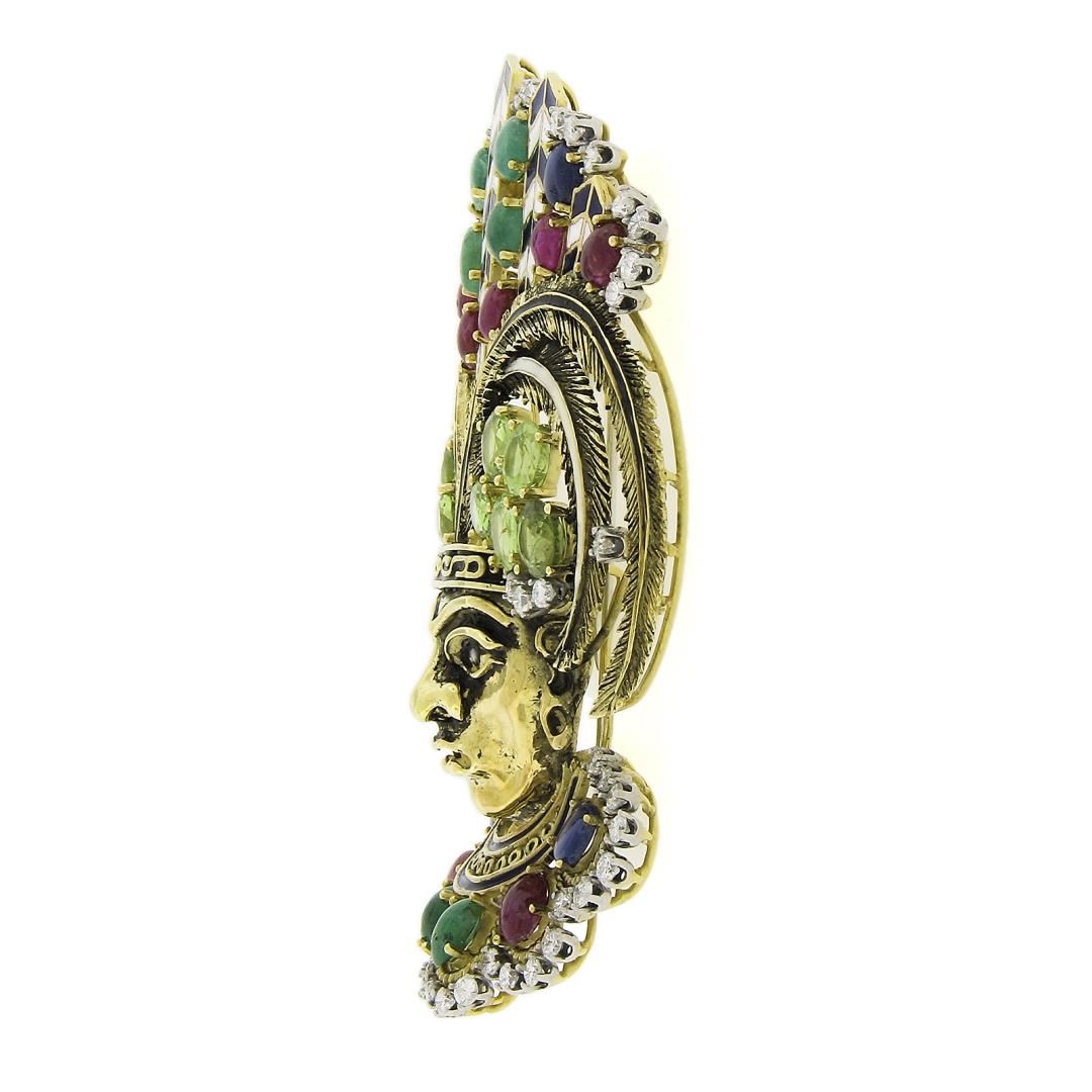 A vintage solid 18k yellow gold tribal face brooch, with multi colors enamel work and 10 oval & round cut natural peridots (6.7-7.5 mm x 6-6.4 mm & 6.5mm), 4 round & oval cabochon cut natural sapphires (6.5-7 mm x 5.8-6 mm & 5.75mm), 8 oval cabochon cut natural ruby (6-8.1 mm x 4.5-5.7 mm), 6 oval & round cabochon cut natural emeralds (6.5-7 mm x 5.3-6.5 mm & 7.2mm), and 55 round cut natural diamonds (G/H - VS1-SI2 w/ Few I ; 4.25ctw). Measures 93.7x70.7mm and weighs a total of 76.53 grams.