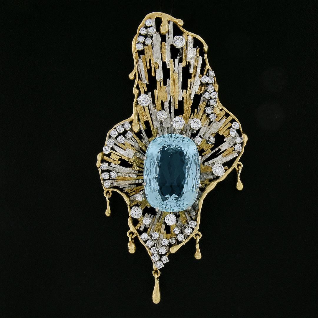 A vintage solid 18k yellow & white gold brooch, with 1 GIA garded elongated cushion cut natural aquamarine (23ct), and 56 round cut natural diamonds (F/G - VS1/VS2 ; 3ctw). Measures 86x41.7mm and weighs a total of 35.50 grams. Comes with all original relevant certifications.