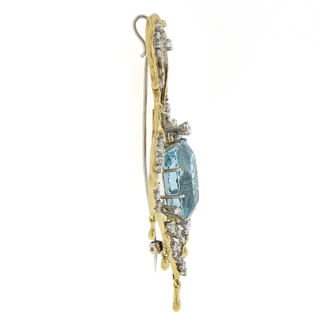 A vintage solid 18k yellow & white gold brooch, with 1 GIA garded elongated cushion cut natural aquamarine (23ct), and 56 round cut natural diamonds (F/G - VS1/VS2 ; 3ctw). Measures 86x41.7mm and weighs a total of 35.50 grams. Comes with all original relevant certifications.