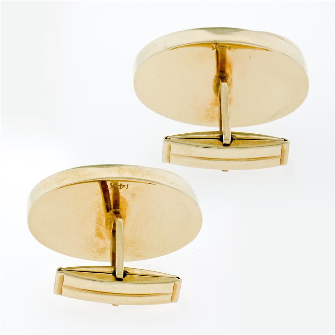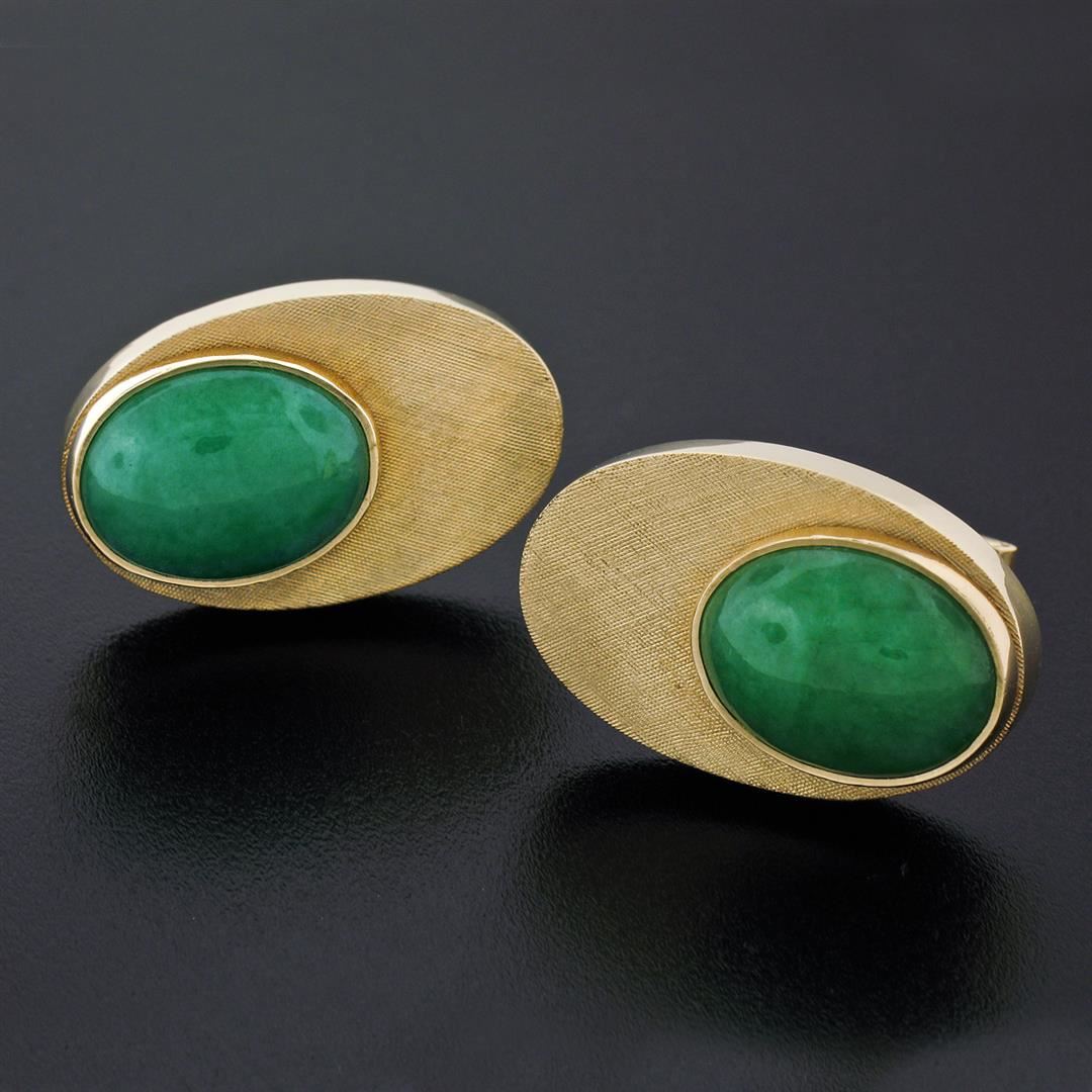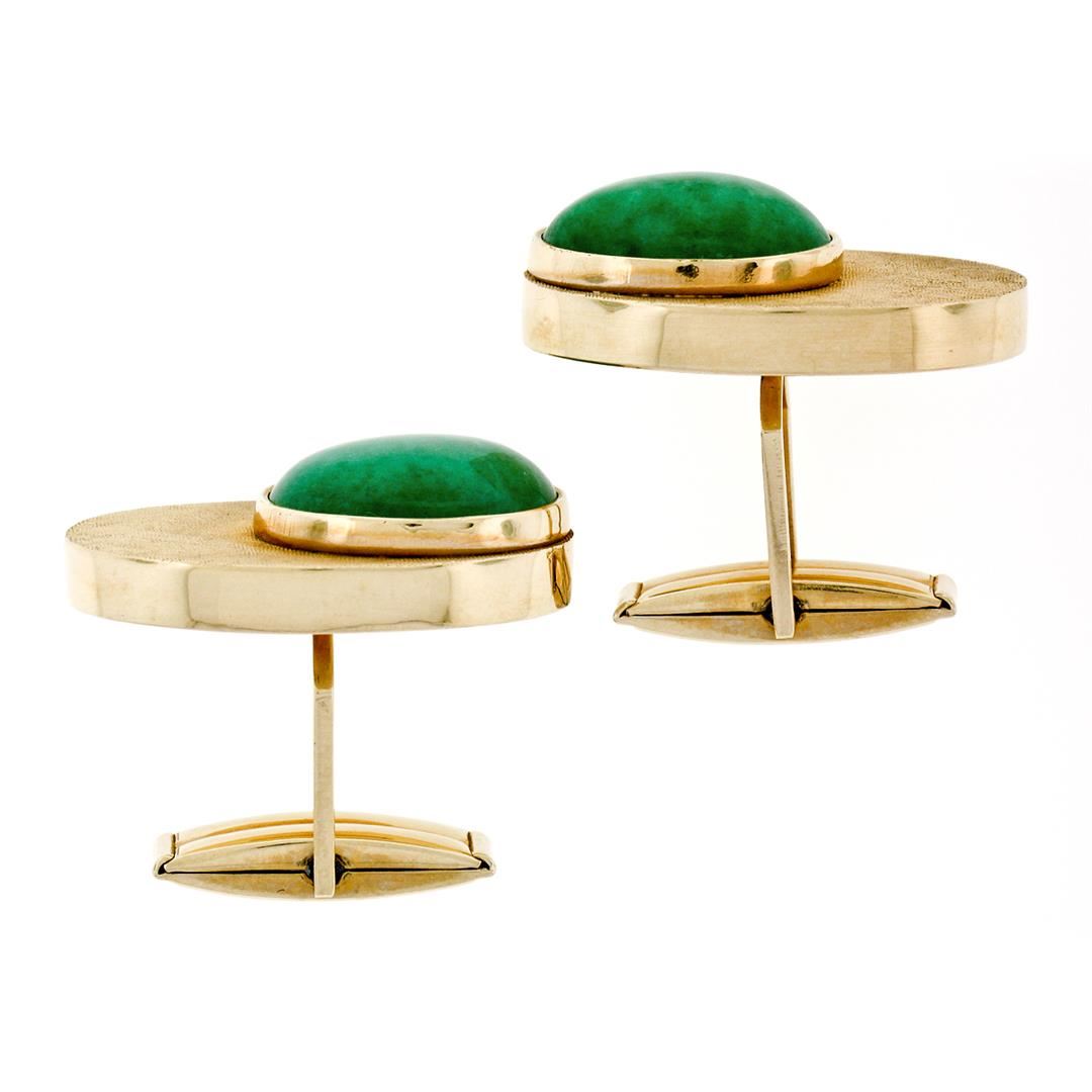 A vintage solid 14k yellow gold puffed florentine cufflinks, featuring 2 oval cut natural jade (15.55x11.75mm). These cuff links have a swivel design with a clearance of 12.65mm, weigh a total of 19.57 grams, and the front panels measure 27.35x17.35mm.