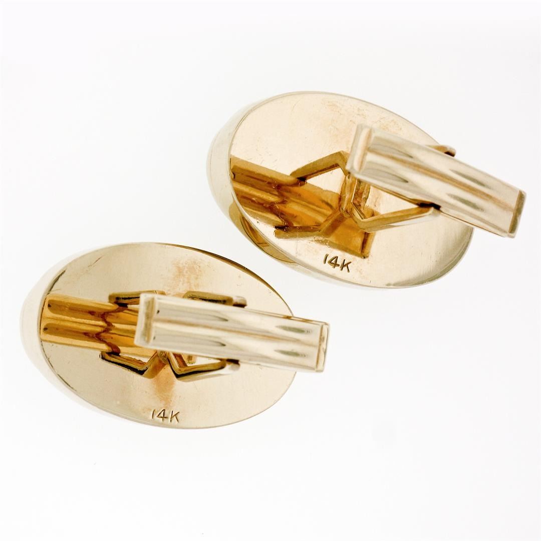 A vintage solid 14k yellow gold puffed florentine cufflinks, featuring 2 oval cut natural jade (15.55x11.75mm). These cuff links have a swivel design with a clearance of 12.65mm, weigh a total of 19.57 grams, and the front panels measure 27.35x17.35mm.