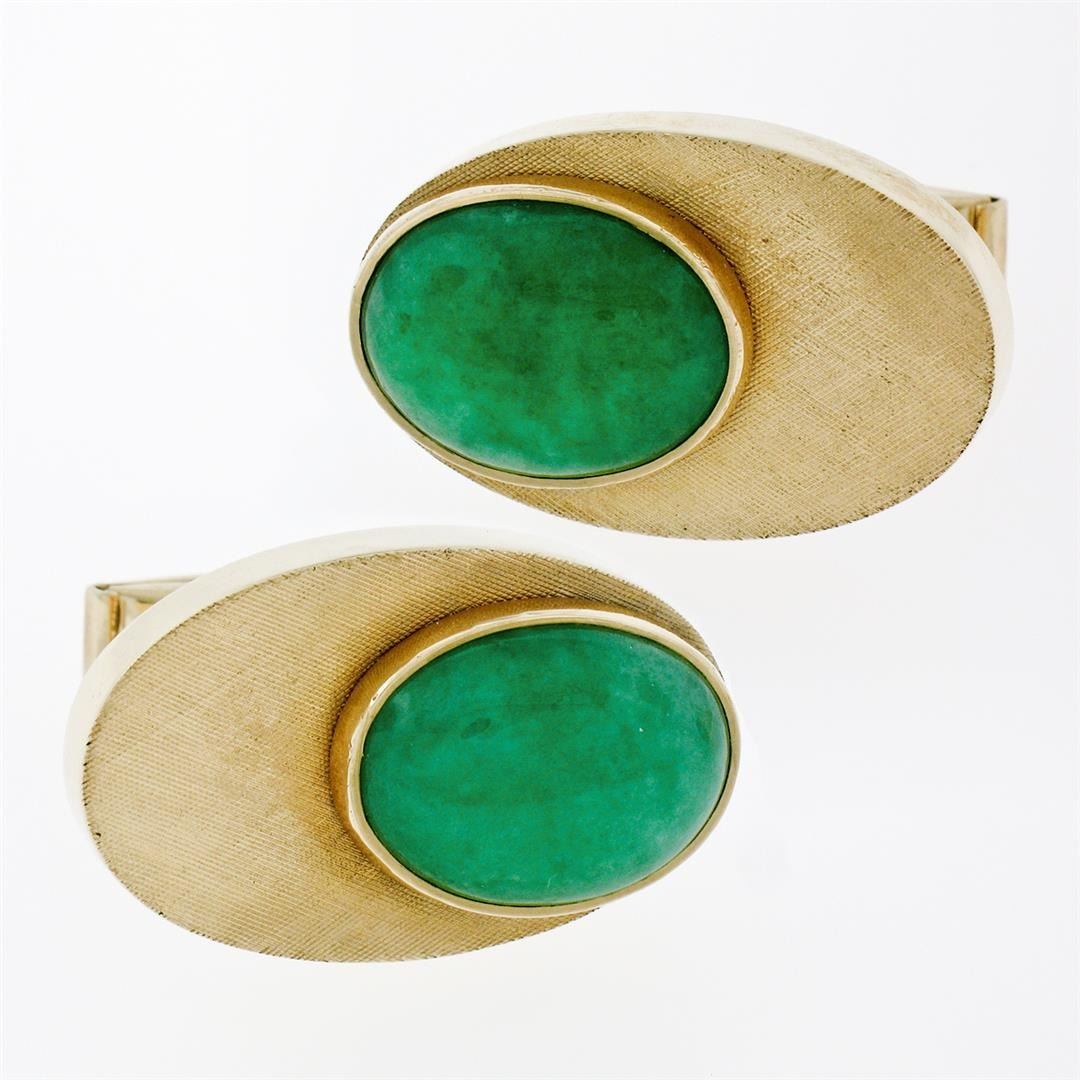 A vintage solid 14k yellow gold puffed florentine cufflinks, featuring 2 oval cut natural jade (15.55x11.75mm). These cuff links have a swivel design with a clearance of 12.65mm, weigh a total of 19.57 grams, and the front panels measure 27.35x17.35mm.