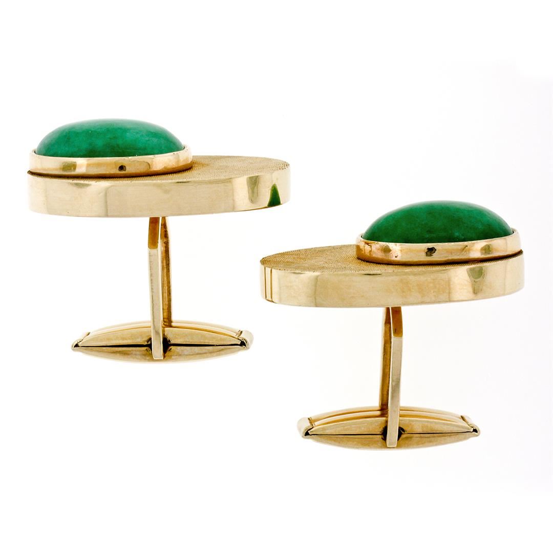 A vintage solid 14k yellow gold puffed florentine cufflinks, featuring 2 oval cut natural jade (15.55x11.75mm). These cuff links have a swivel design with a clearance of 12.65mm, weigh a total of 19.57 grams, and the front panels measure 27.35x17.35mm.