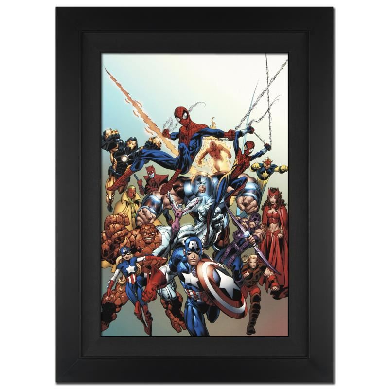 A piece of comic book history, this limited edition, from original art by Mark Bagley, depicts classic characters from the Marvel Universe. Mark Bagley got his start by winning Marvel's Try-Out contest, for which he was awarded penciling jobs. Soon, Bagley was drawing regularly for the renowned Spider-Man franchise. "Last Hero Standing #1" is an extremely limited edition giclee on canvas by Mark Bagley presented by Marvel Comics, hand signed by the great Stan Lee and numbered out of only 10! This piece comes custom framed and ready to hang. Includes Certificate of Authenticity! Measures approx. 25" x 34" (with frame), 18" x 27" (image).